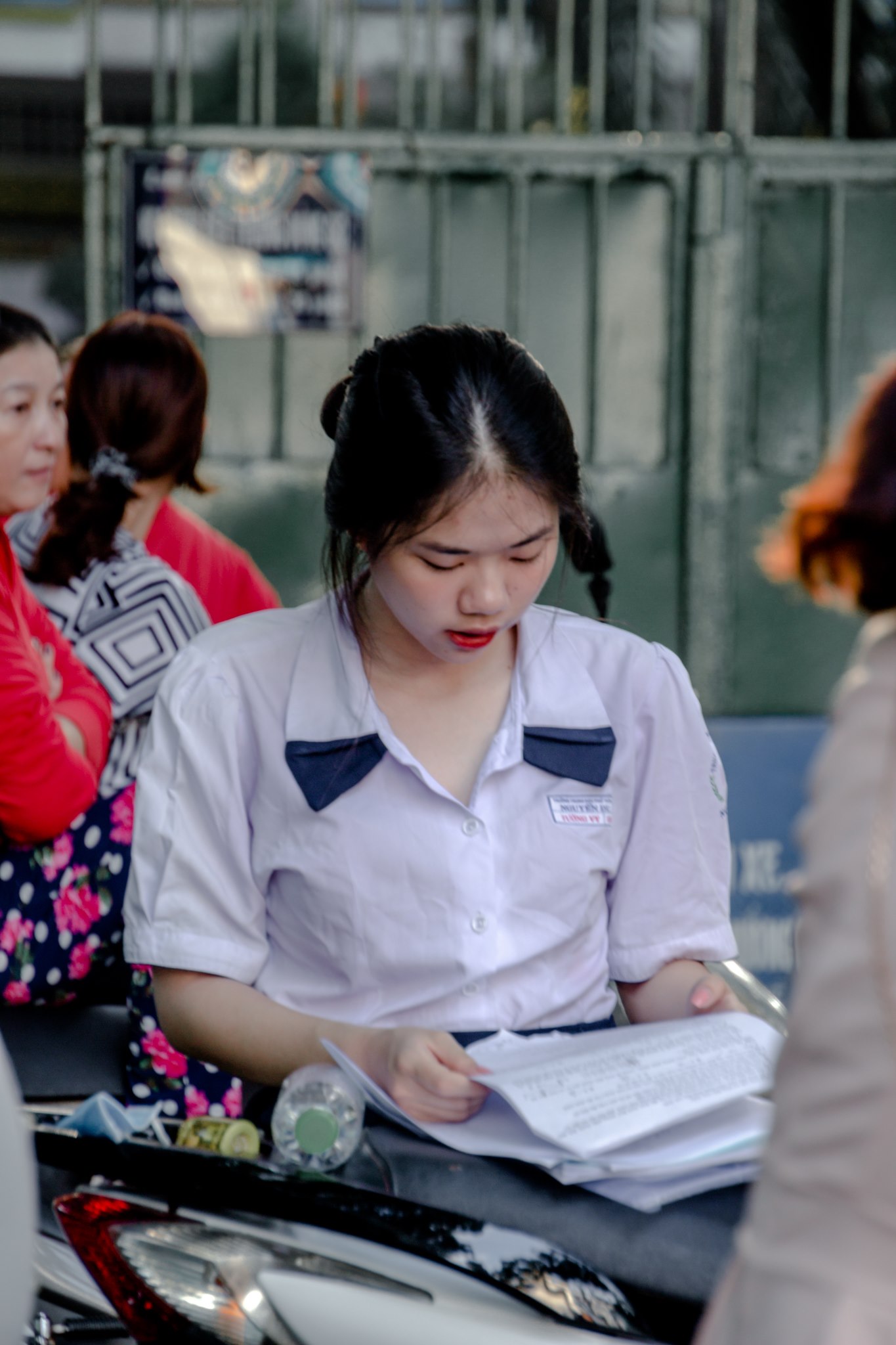 Thí sinh nữ tại điểm thi THPT Nguyễn Khuyến (quận 10, TP.HCM) tranh thủ ôn bài trước khi bước vào phòng thi.