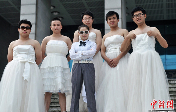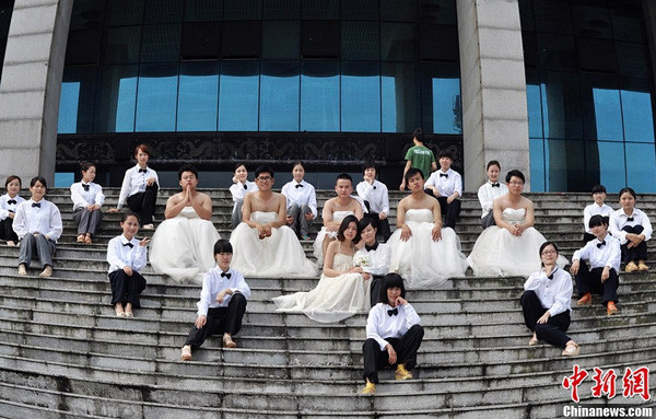 Tập thể lớp mặc áo cưới thay vì trang phục truyền thống dành riêng cho cử nhân. Đáng chú ý là cô dâu do các nam sinh đóng giả còn chú rể lại do các bạn nữ đảm nhận. Ảnh: China News.