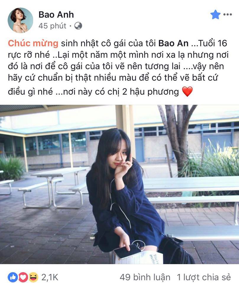 Trên trang cá nhân, nhiều lần Bảo Anh cũng thể hiện tình cảm đặc biệt dành cho em gái. Trong dịp sinh nhật mừng Bảo An tròn 16 tuổi: “Chúc mừng sinh nhật cô gái của tôi…Tuổi 16 rực rỡ nhé ..Lại một năm một mình nơi xa lạ nhưng nơi đó là nơi để cô gái của tôi vẽ nên tương lai… vậy nên hãy cứ chuẩn bị thật nhiều màu để có thể vẽ bất cứ điều gì nhé… nơi này có chị 2 hậu phương”.