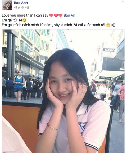 Trên trang cá nhân, ca sĩ Bảo Anh thường xuyên khoe về em gái mình nên fan cũng không còn cảm thấy xa lạ với cái tên Bảo An. Dựa vào những bức ảnh mà nữ ca sĩ chia sẻ và ảnh trên trang cá nhân của Bảo An, người ta có thể nhận ra chỉ sau khoảng 3 năm du học ở Úc, cô bạn sinh năm 2002 này đã thay đổi rất nhiều.