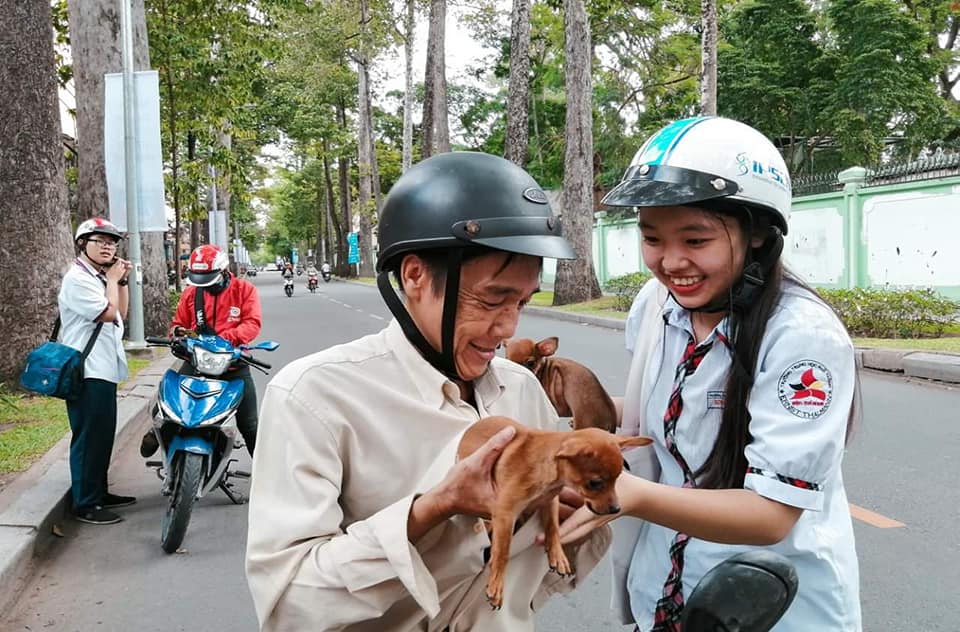 Khi nhìn thấy 2 chú chó nhỏ, nữ sinh không khỏi thích thú và vui mừng. Ảnh: Vũ Huy Anh