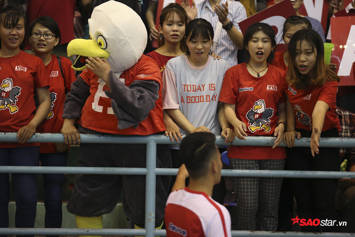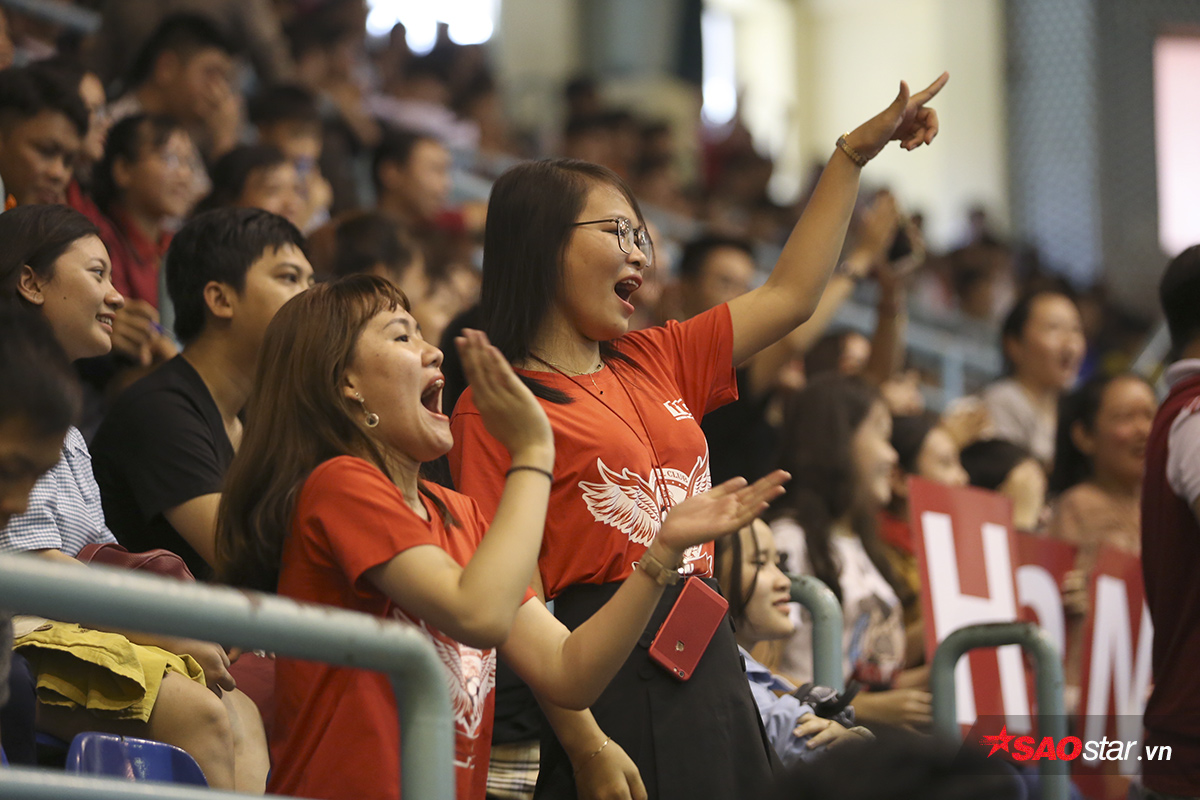 Tất nhiên, không thiếu những “fan cuồng”. Trong ảnh, hai cô gái đến từ trường Hồng Bàng nhảy múa ăn mừng chiến thắng của đội.