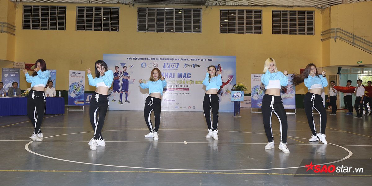 Cùng với futsal, bộ môn Nhảy đối kháng luôn được người hâm mộ chờ đợi bởi sự nóng bỏng, xinh đẹp và phá cách đến từ các trường. Trong ảnh, dàn hoạt náo viên với màn khuấy động sân khấu ngày khai mạc.