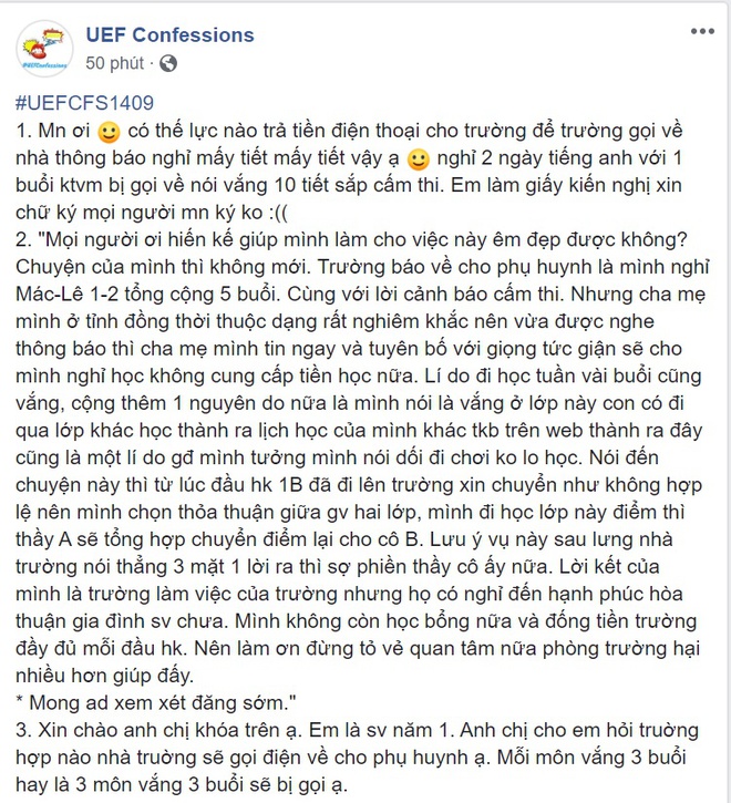 Mới đây, trên diễn đàn ẩn danh của sinh viên ĐH Kinh tế - Tài chính TP.HCM (UEF Confession), nhiều sinh viên phàn nàn, thậm chí là có phần bức xúc khi bị nhà trường gọi điện báo phụ huynh về số buổi vắng học cùng những lời dọa nạt cấm thi.