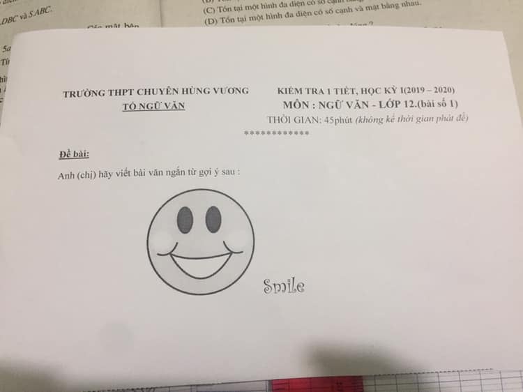 Mới đây, mạng xã hội xuất hiện một đề bài môn Ngữ Văn với một gợi ý khiến nhiều người phải bận tâm suy nghĩ. Nói là gợi ý nhưng thực chất cả tờ giấy chỉ có đúng hình mặt cười và chữ smile khá nổi bật. Dẫu biết rằng đây đề mở nhằm gợi sự sáng tạo của các cô cậu học trò nhưng khi cầm tờ đề lên vẫn hẳn sẽ khiến nhiều người băn khoăn suy nghĩ hướng làm.
