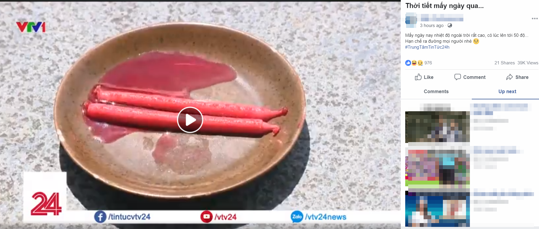 Theo những gì PV VTV24 phản ánh, chỉ trong 20 phút, những cây nến khi để ngoài trời đã tan chảy thành nước. Nhiệt kế đo ngoài trời là hơn 50 độ C trong khi đó, số liệu quan sát được trong lều khí tượng là 38,5.