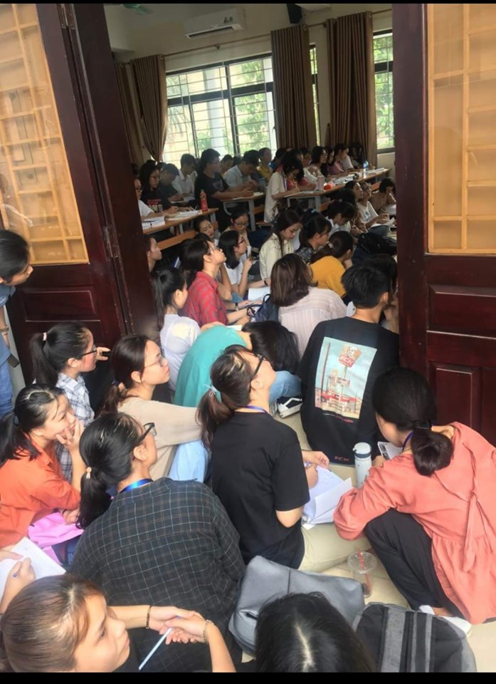 Hình ảnh các tân sinh viên ngồi tràn ra cả hành lang để nghe sinh hoạt được một người dùng ghi lại tại trường Đại học Luật Hà Nội. Ảnh: Khanh Nguyen/Group Trường Người Ta
