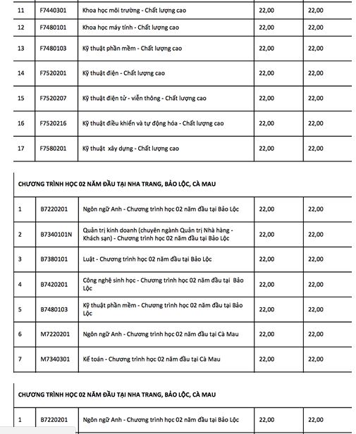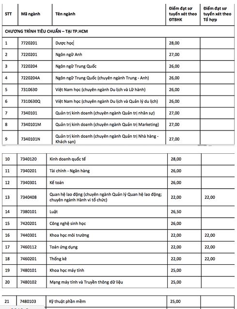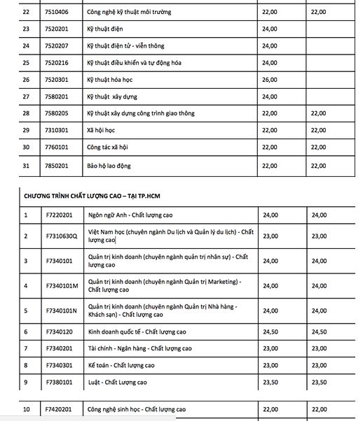 Trường đại học Công nghệ TP.HCM cũng vừa công bố điểm chuẩn đợt xét học bạ 30/6, mức điểm cao nhất là 22 ở ngành Dược học và Kinh tế xây dựng. Các ngành khác đều có mức điểm từ 18 - 21 điểm tùy tổ hợp môn xét tuyển.