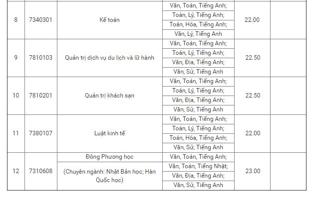 Ngành Ngôn ngữ Anh của trường lấy điểm chuẩn cao nhất so với các trường cùng xét tuyển theo học bạ với mức điểm là 30 cho cả 3 tổ hợp Toán - Văn - Anh, Toán - Lý - Anh, Văn - Địa - Anh. 11 Ngành học khác có điểm trúng tuyển tối thiểu là 22 điểm cho 3 tổ hợp.