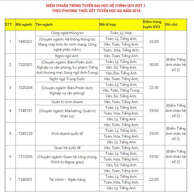 Trường xét tuyển học bạ lớp 12 ba môn theo 7 tổ hợp với 16 ngành tuyển sinh, mức điểm trúng tuyển từ 18 - 22 điểm. Danh sách trúng tuyển được công bố trên trang web của nhà trường.