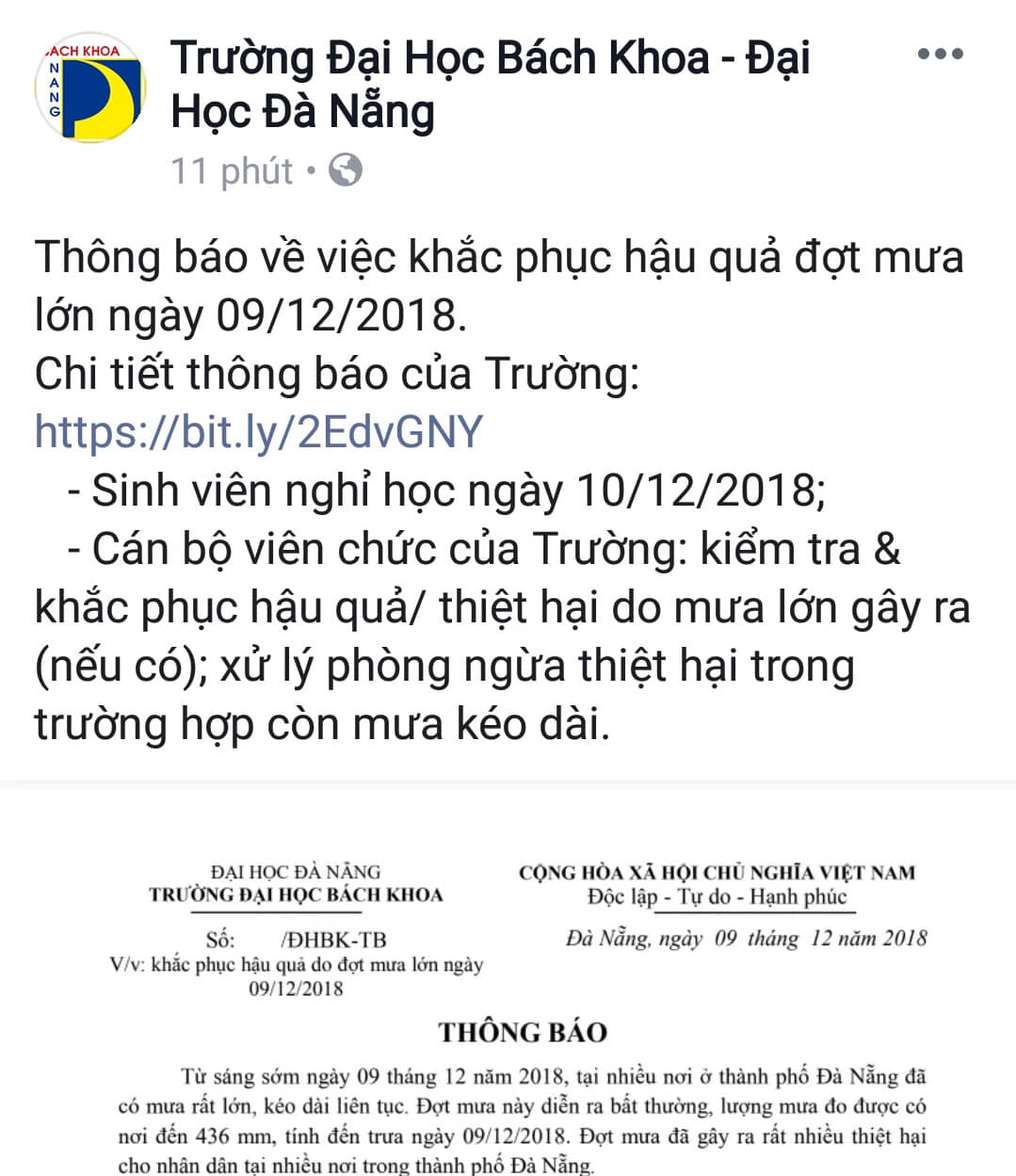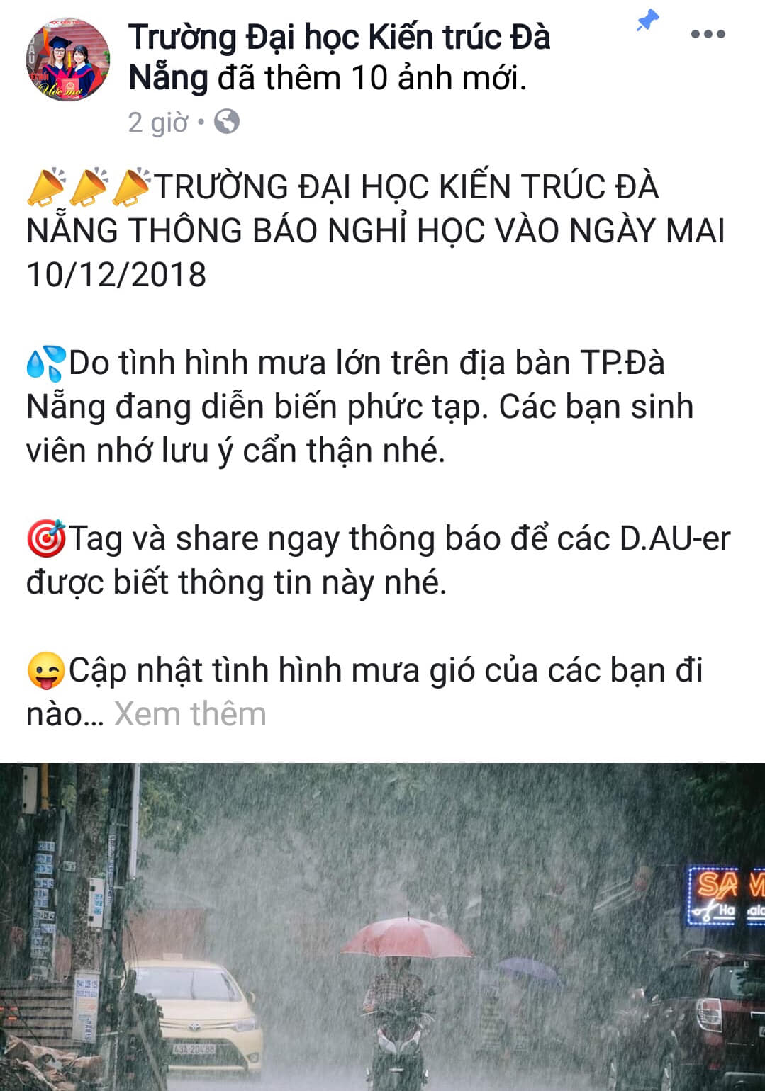 Trên fanpage các trường Đại học trên địa bàn thành phố Đà Nẵng cũng đã nhanh chóng đăng tải thông tin cho sinh viên nghỉ học do mưa lớn, ngập nặng để tránh xảy ra những tai nạn đáng tiếc cho các bạn.