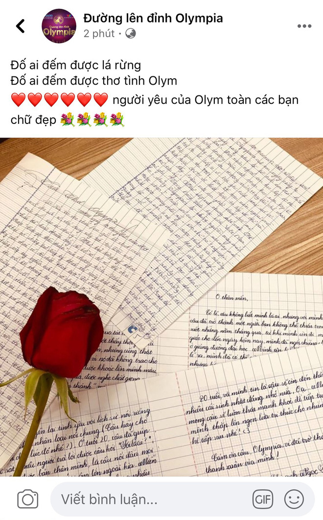 Mới đây, Fanpage Đường lên đỉnh Olympia đã chính thức đăng tải bức ảnh chụp rất nhiều lá thư của khán giả hâm mộ cũng như các thí sinh từng tham gia chương trình với dòng trạng thái: “Đố ai đếm được lá rừng/ Đố ai đếm được thơ tình Olym/ Người yêu của Olym toàn các bạn chữ đẹp.”