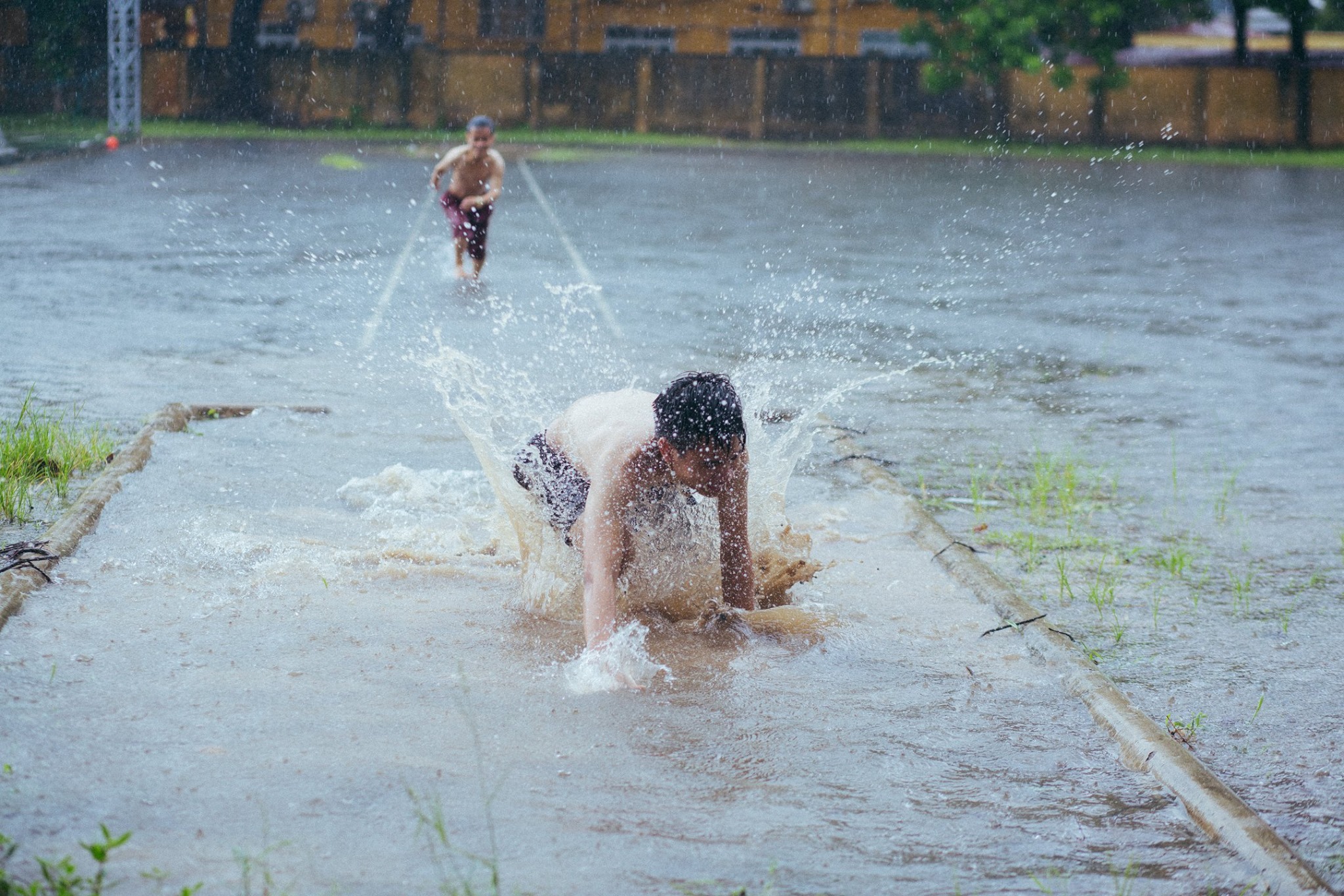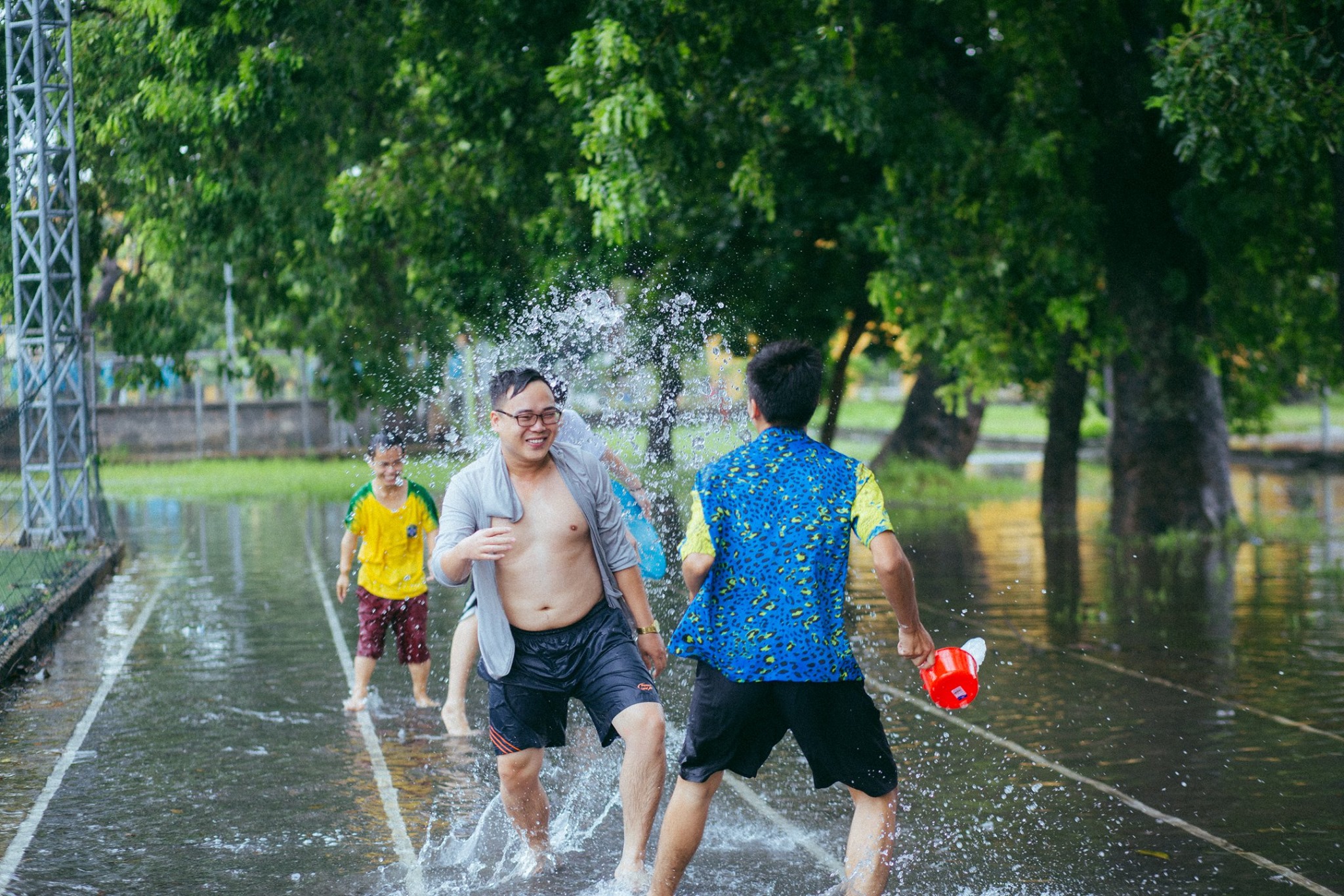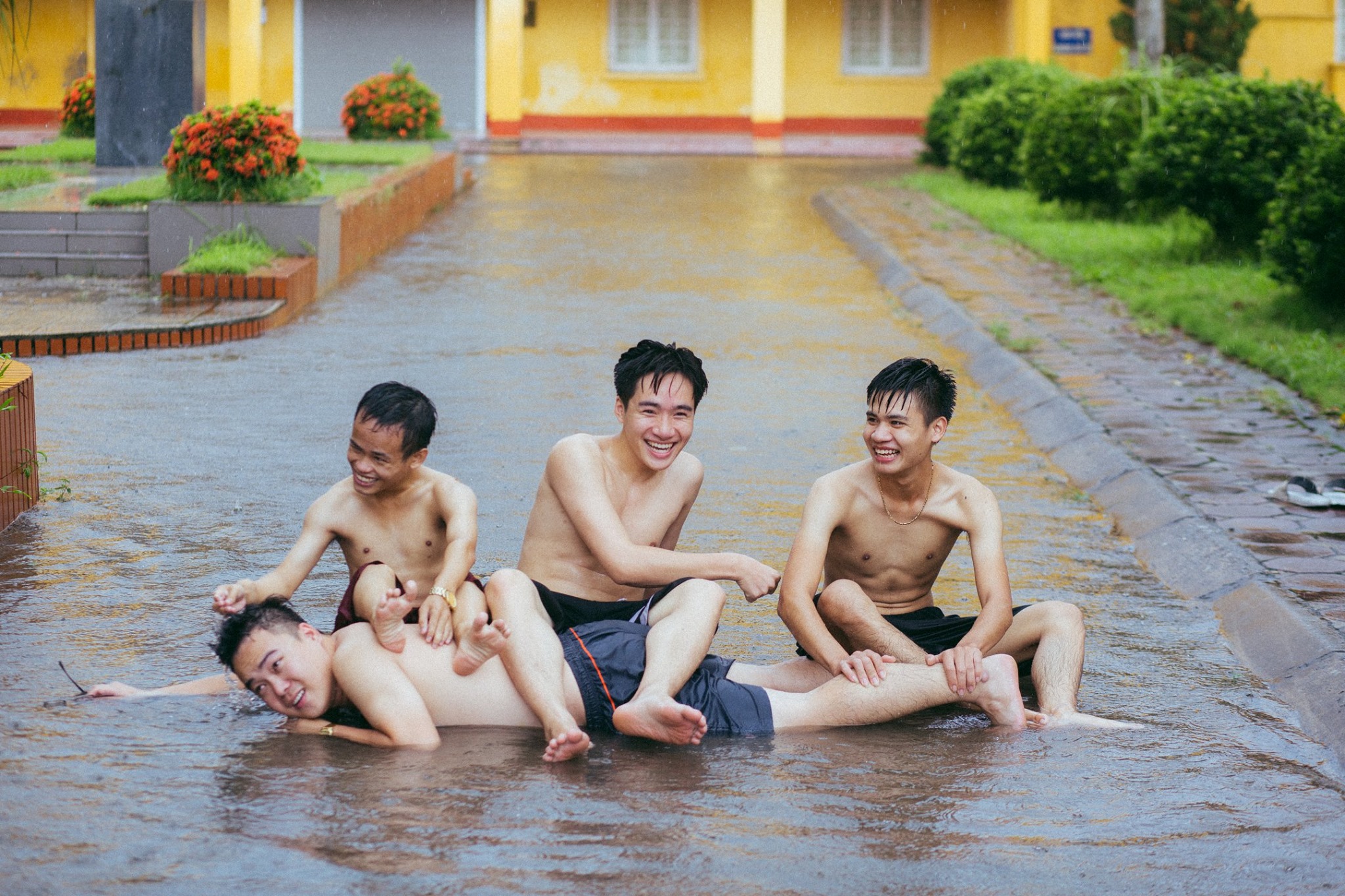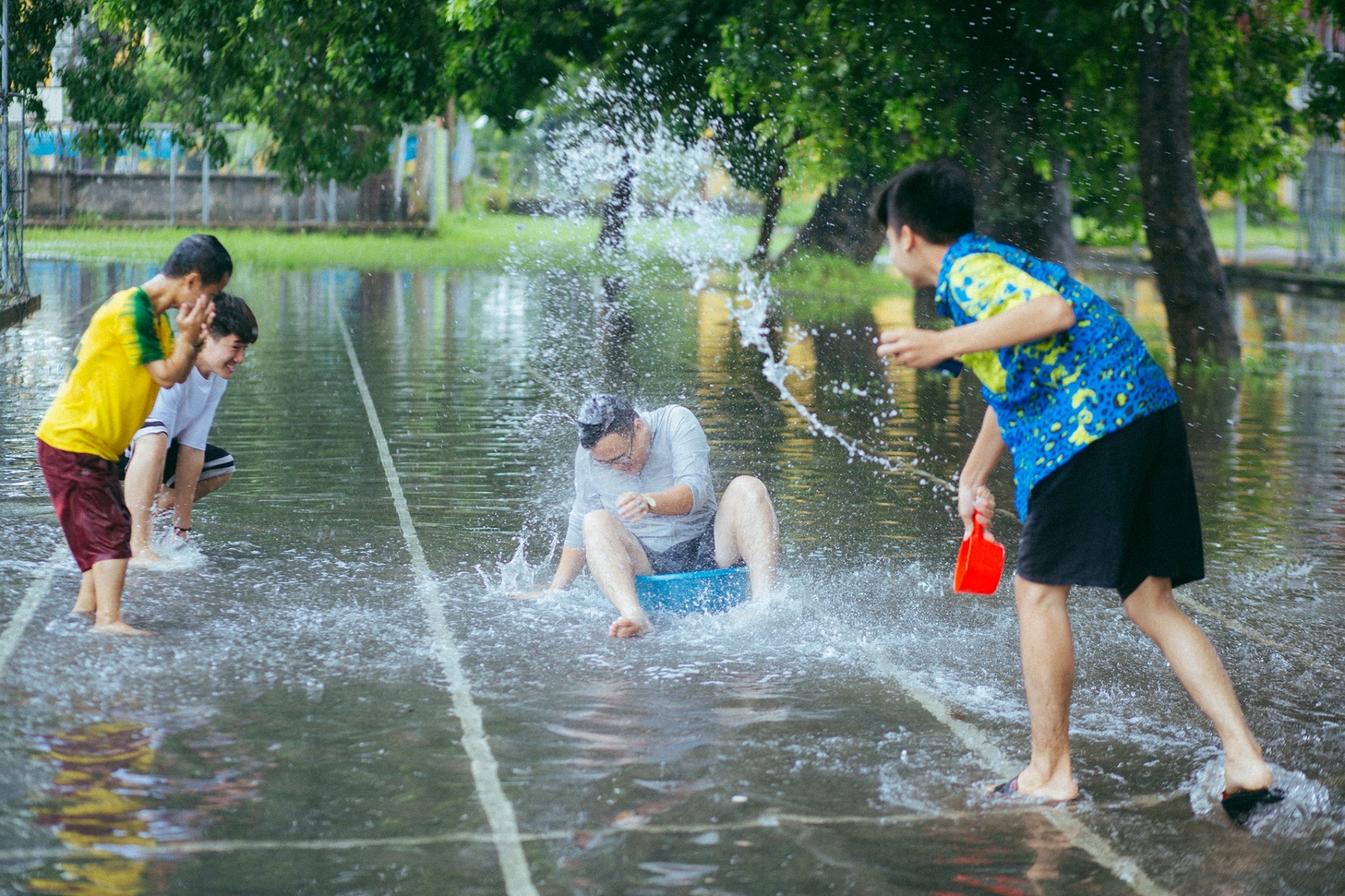 Theo đó, các chàng trai này đã rủ nhau cùng tắm mưa, bơi lội và vui đùa ngay trong khuôn viên trường học trong thời tiết bão bùng. Gương mặt ai cũng háo hức, nụ cười rạng rỡ của các nam sinh khiến bất kỳ ai bắt gặp cũng không khỏi thích thú.