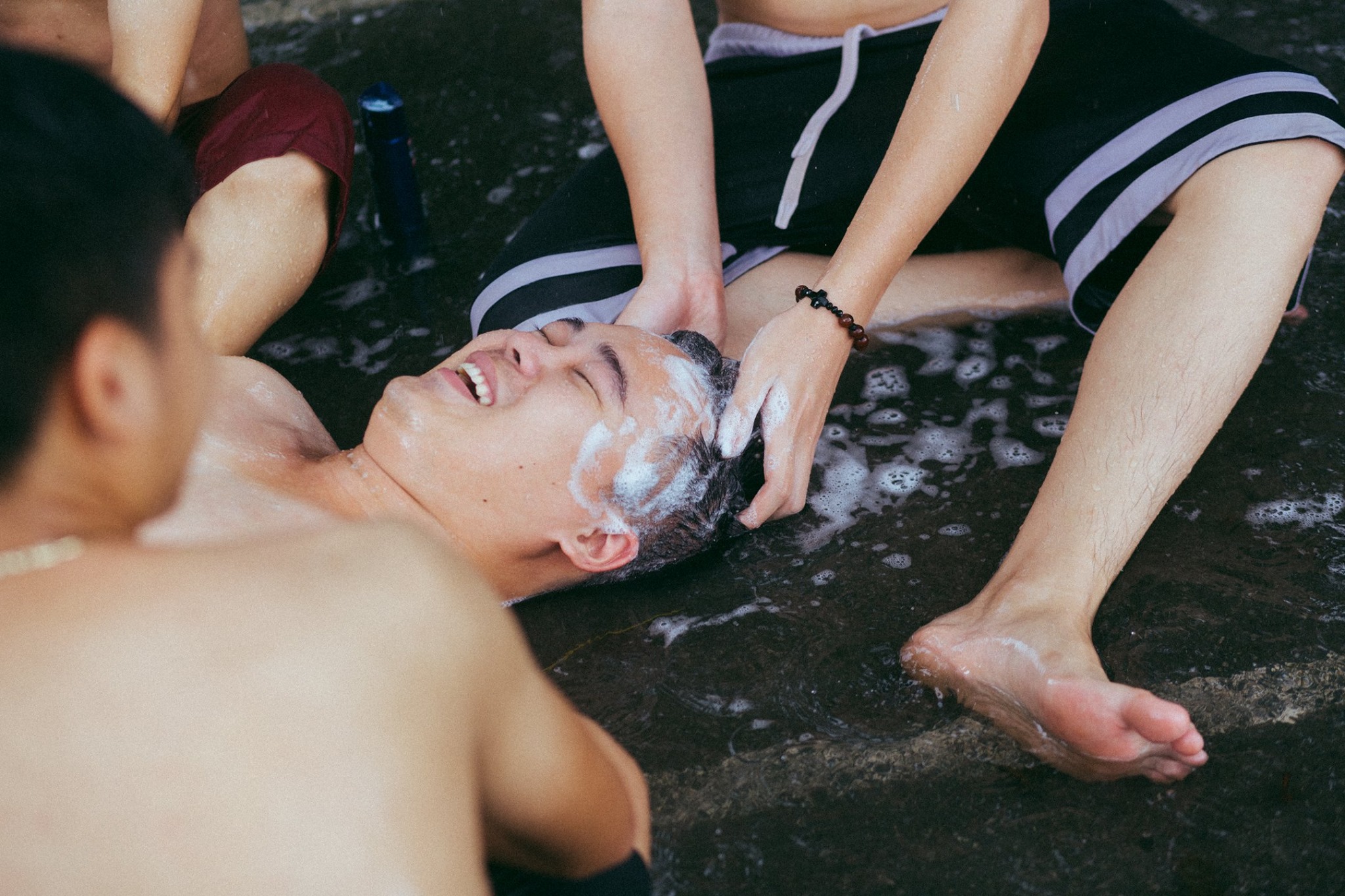 Tắm mưa nhưng rất đầu tư, mang hẳn dầu gội theo.