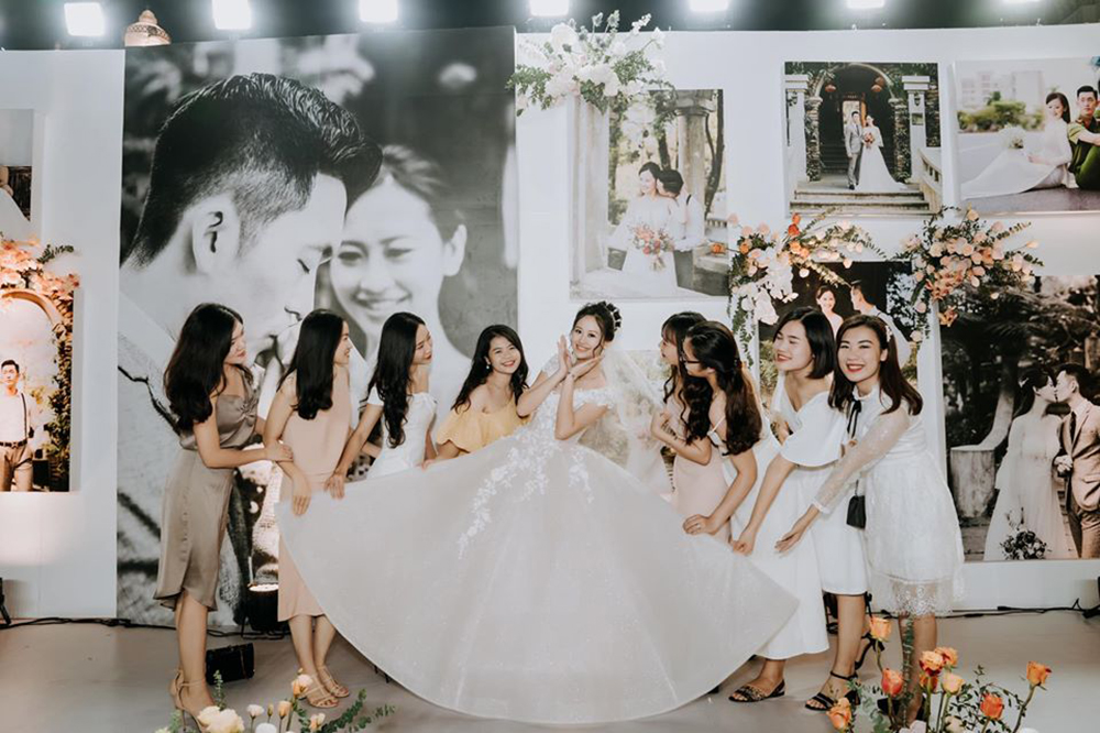 Cô dâu rạng rỡ cùng bạn bè trong ngày trọng đại.