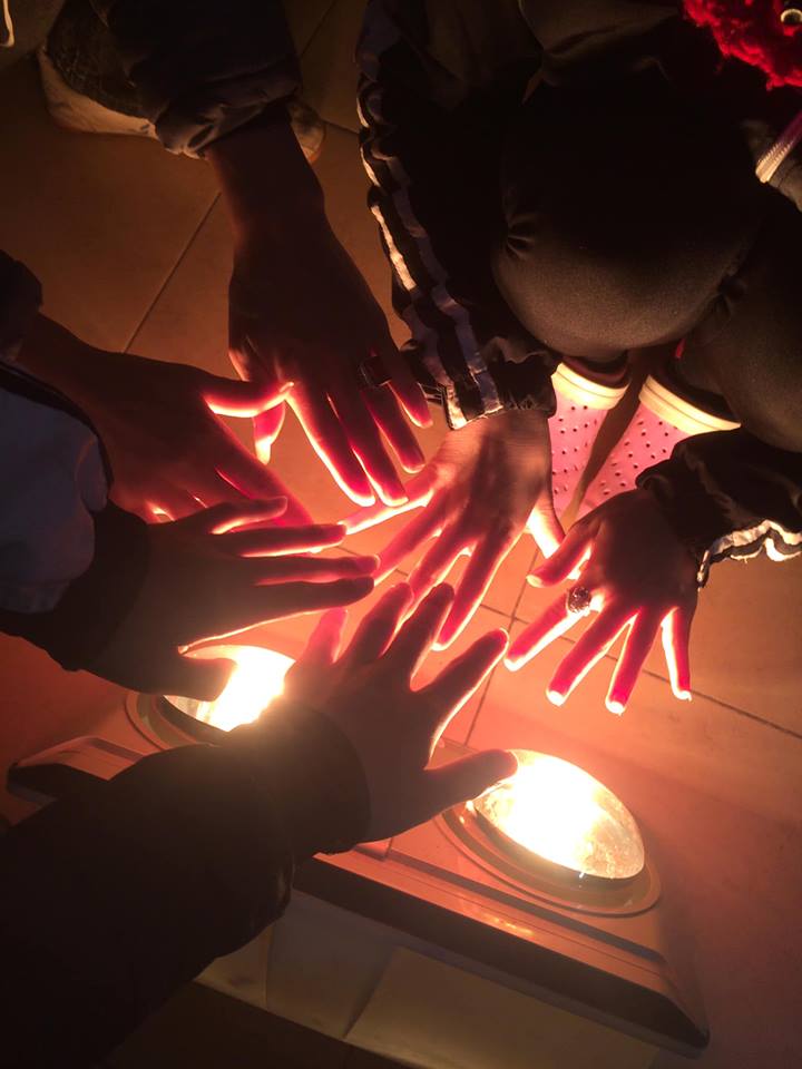 Một cái đèn sưởi, hàng chục bàn tay cùng chìa ra hứng chút tia sáng ấm áp.