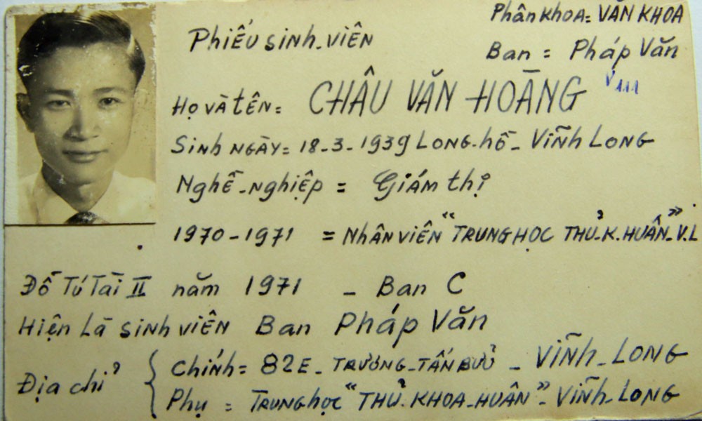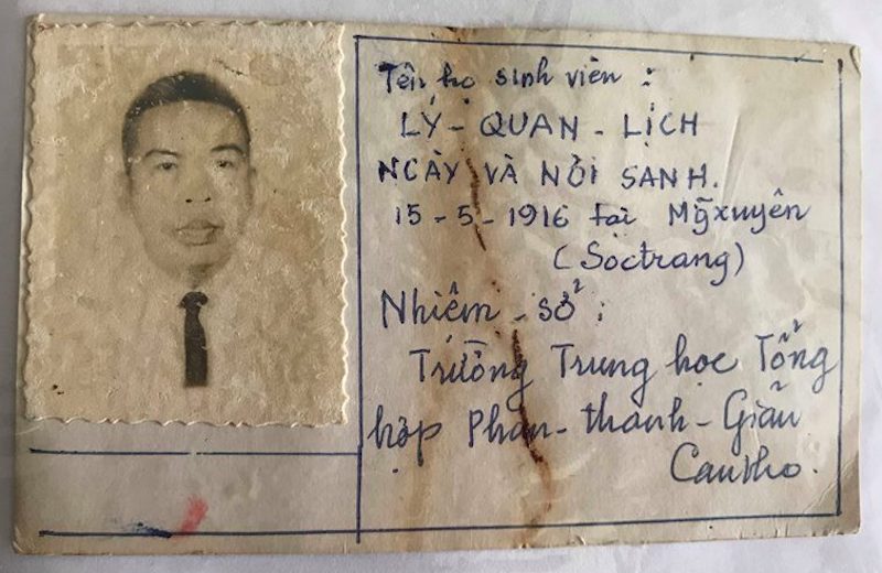 “Và đây là thẻ của ông Lý Quan Lịch. Khi là sinh viên, ông Lịch đã là giáo viên Trường THPT Phan Thanh Giản (nay là THPT Châu Văn Liêm). Ông Lịch hơn tôi 22 tuổi. Dù vậy, mỗi lần gặp tôi, ông Lịch đều đứng xa chắp tay chào thầy. Sau này, con và cháu của ông Lịch đều học của tôi”…