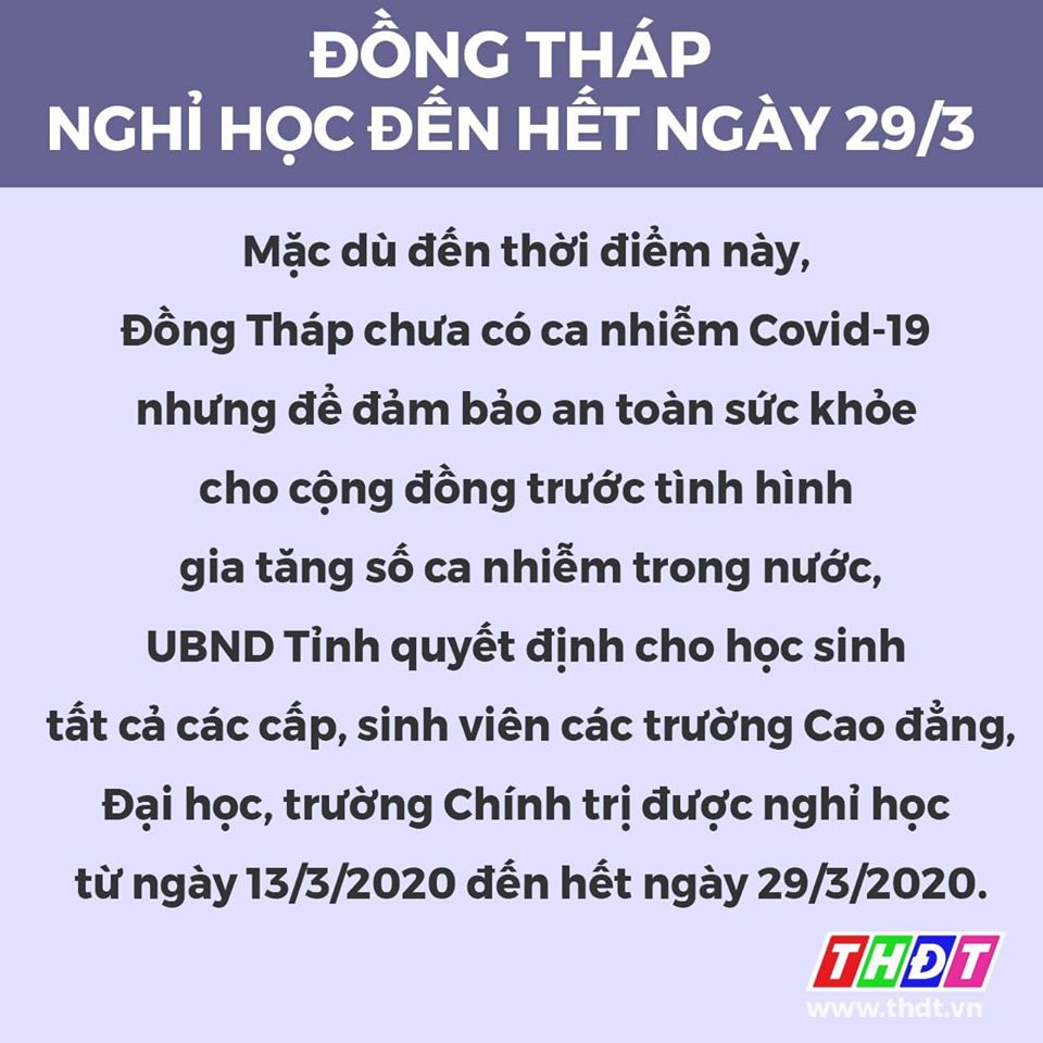 Đồng Tháp: Học sinh các cấp từ mầm non đến THPT, GDTX, học viên, sinh viên các cơ sở giáo dục nghề nghiệp được nghỉ từ ngày 13/3 đến 29/3.