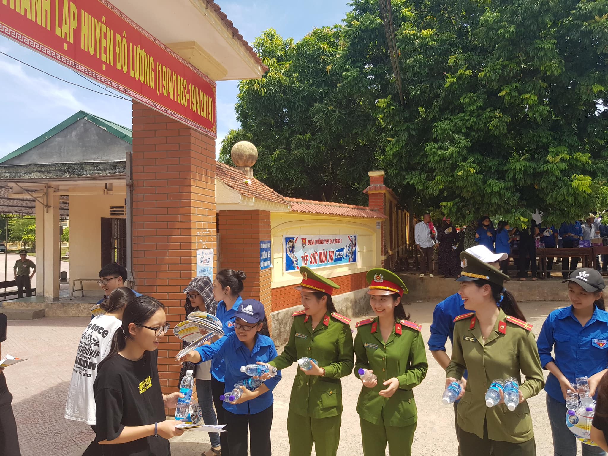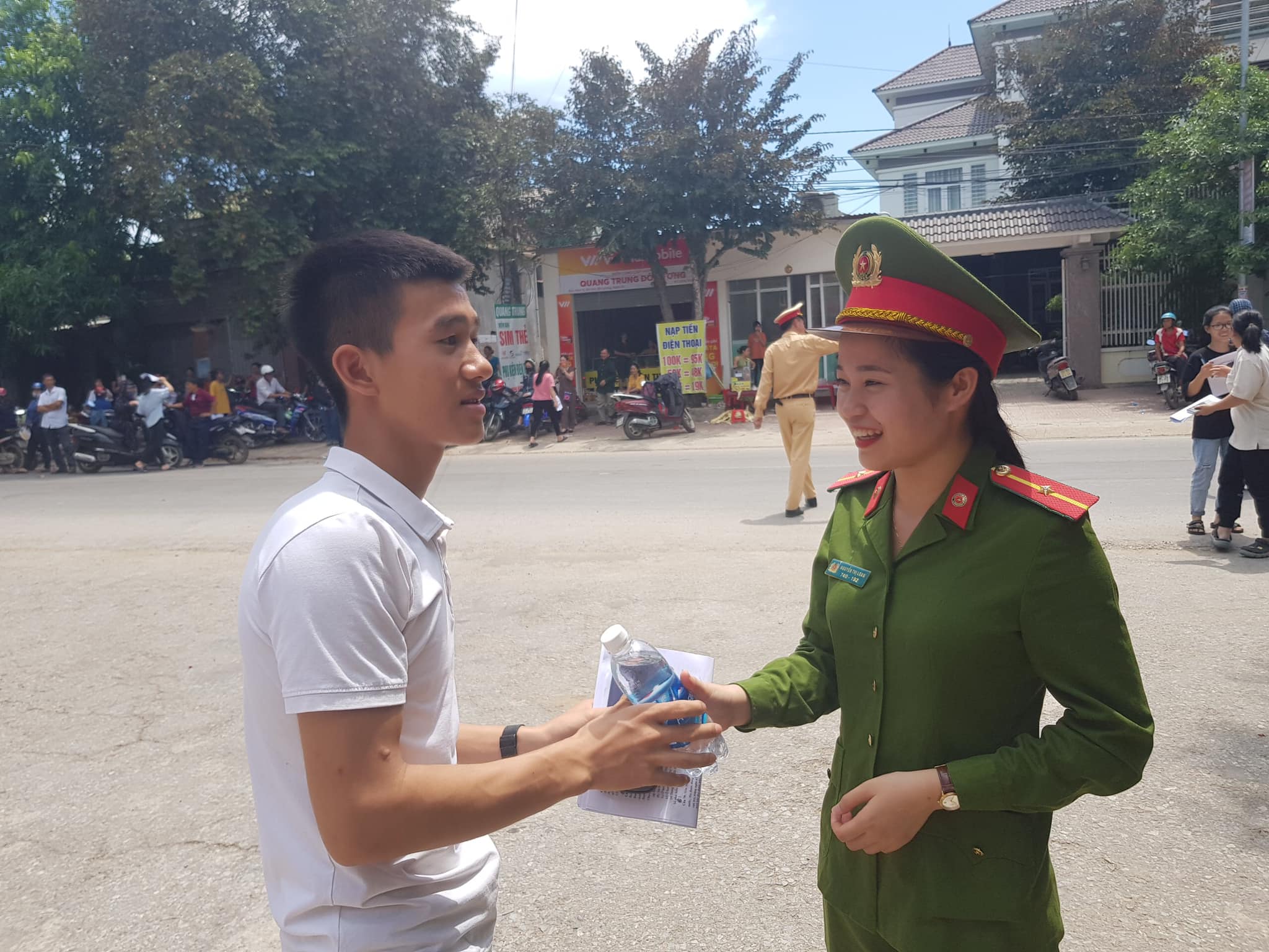 Trong sáng ngày 26/6, cùng các với đồng đội, Thiếu úy Nguyễn Mai Phương đã có mặt tại điểm thi THPT Quốc gia để tham gia trao tặng nước lọc, báo và khăn lạnh tới các em thí sinh và người nhà tại các điểm thi THPT Quốc gia trên địa bàn huyện Đô Lương.