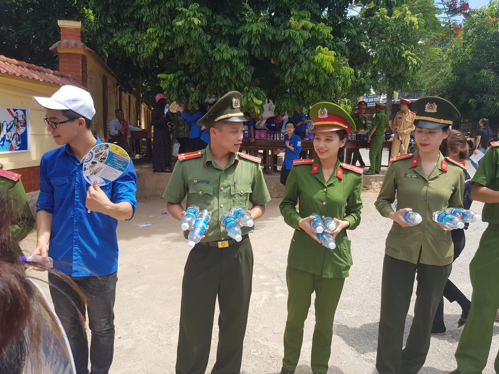 Trong kỳ thi THPT quốc gia 2019, bắt đầu từ ngày 24/6 - 27/6, tại nhiều điểm thi trên cả nước, nhiều phụ huynh và học sinh cảm thấy thích thú khi thấy các chiến sĩ công an, CSGT xuất hiện trước cổng trường điều tiết giao thông, đồng thời cùng các tình nguyện viên tiếp sức mùa thi tổ chức phát nước uống cho thí sinh, phụ huynh.