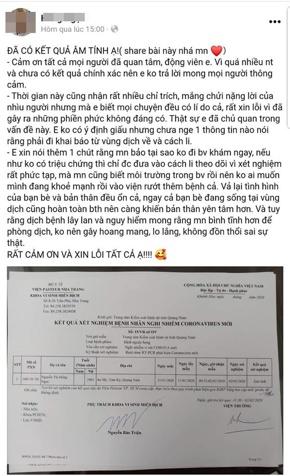 Ngay sau khi có kết quả, nữ sinh đã vui mừng đăng tải thông báo trên trang facebook cá nhân, đồng thời cô nàng cũng có những tâm sự sau khi hứng chịu nhiều chỉ trích sau thời gian cách ly vừa qua. N. cho biết, trong thời gian cô được cách ly, có khá nhiều người chỉ trích và cho rằng nữ sinh này giấu bệnh, không khai báo bản thân trở về từ thành phố Vũ Hán.