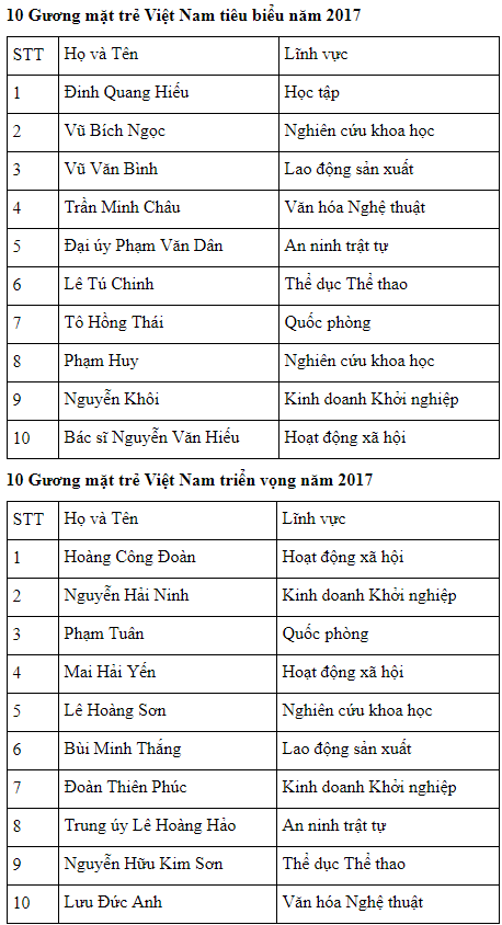 Hội đồng xét chọn đã bỏ phiếu, bầu 10 Gương mặt trẻ Việt Nam tiêu biểu, 10 Gương mặt trẻ Việt Nam triển vọng năm 2017