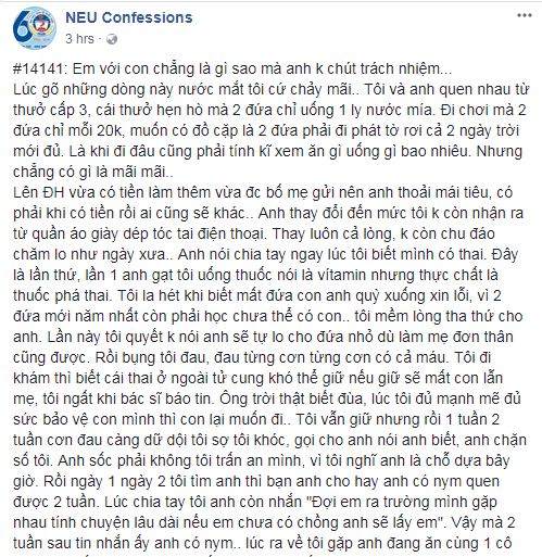 Cụ thể, mới đây một bài viết trên NEU Confession đang khiến dân mạng sục sôi. Cô gái chia sẻ chuyện từng bị người yêu nói lời chia tay ngay khi cô biết tin có bầu. Đã vậy, anh chàng còn nhẫn tâm tới mức lừa bạn gái uống thuốc phá thai khiến cô vô cùng đau khổ, tuyệt vọng.