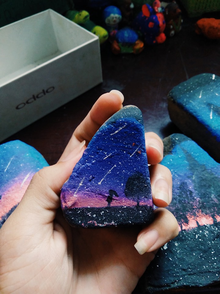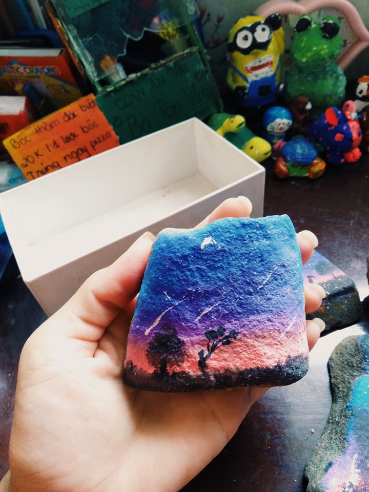 Diễm Quỳnh kể thêm, vào một buổi sáng, cô nàng bỗng nhiên phát hiện mình bị “cấm cửa” do cô em gái mình “bận” vẽ. Cô nàng lén nhìn vào thì thấy em gái đang cặm cụi vẽ một món đồ gì đó, cô nàng đi vào định để nhắc nhở đứa em này học bài thì tình cờ phát hiện ra những sản phẩm “handmade” vô cùng sáng tạo này. Thấy hay nên Quỳnh quyết định chia sẻ những hình ảnh về các hòn đá đầy màu sắc này lên cộng đồng mạng để mọi người cùng xem.