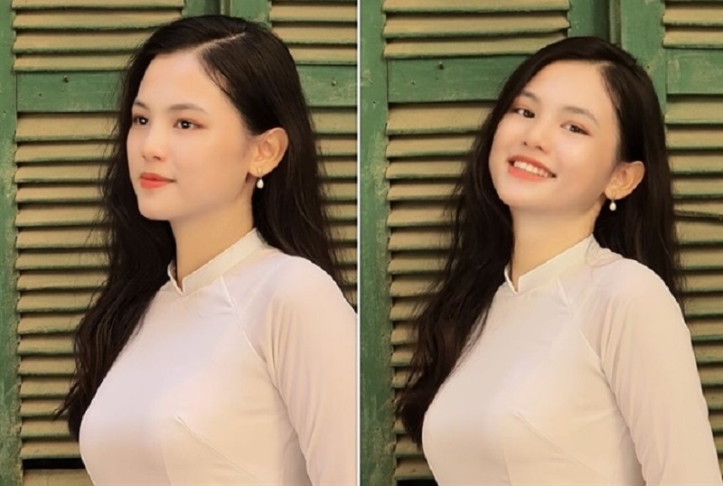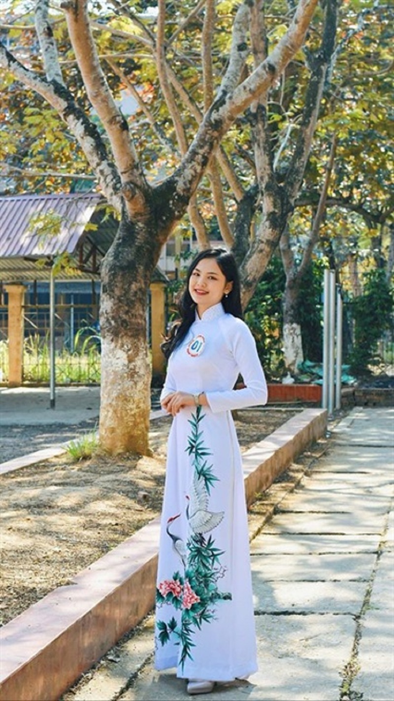 Nụ cười tỏa nắng, mái tóc đen dài cùng trang phục áo dài truyền thống khiến cô bạn xinh xắn hơn bao giờ hết.