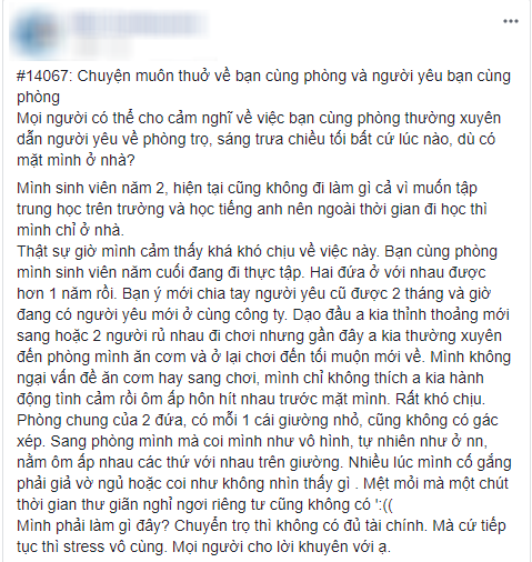 “Mọi người nghĩ sao về việc bạn cùng phòng thường xuyên dẫn người yêu đến chơi, sáng - trưa - chiều - tối bất cứ lúc nào, dù có mặt mình ở nhà? Mình sinh viên năm 2, hiện tại cũng không đi làm vì muốn tập trung học trên trường và học tiếng anh nên ngoài thời gian đi học thì mình chỉ ở nhà. Thật sự giờ mình cảm thấy khá khó chịu về việc này.