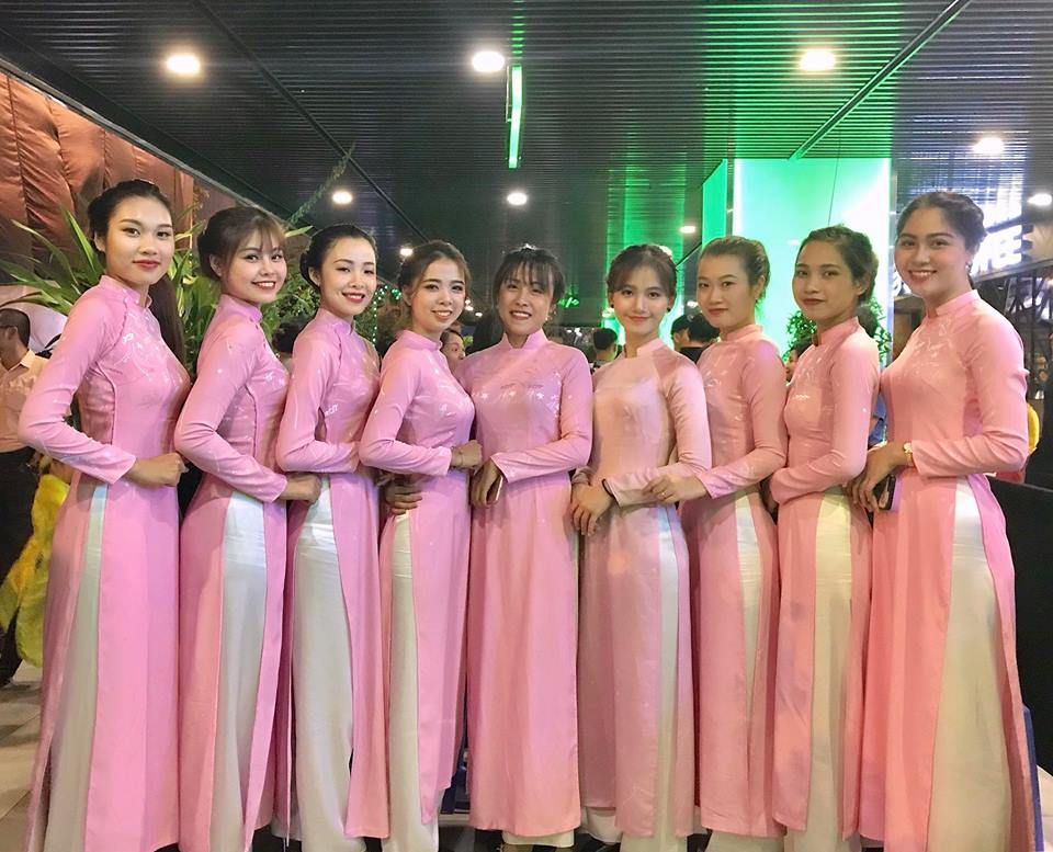 Đội lễ tân của trường ĐH Tôn Đức Thắng trong đồng phục áo dài.