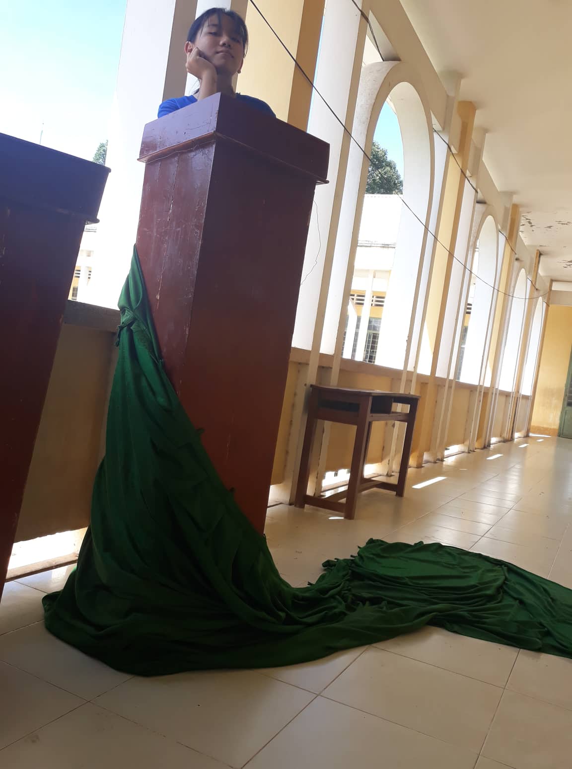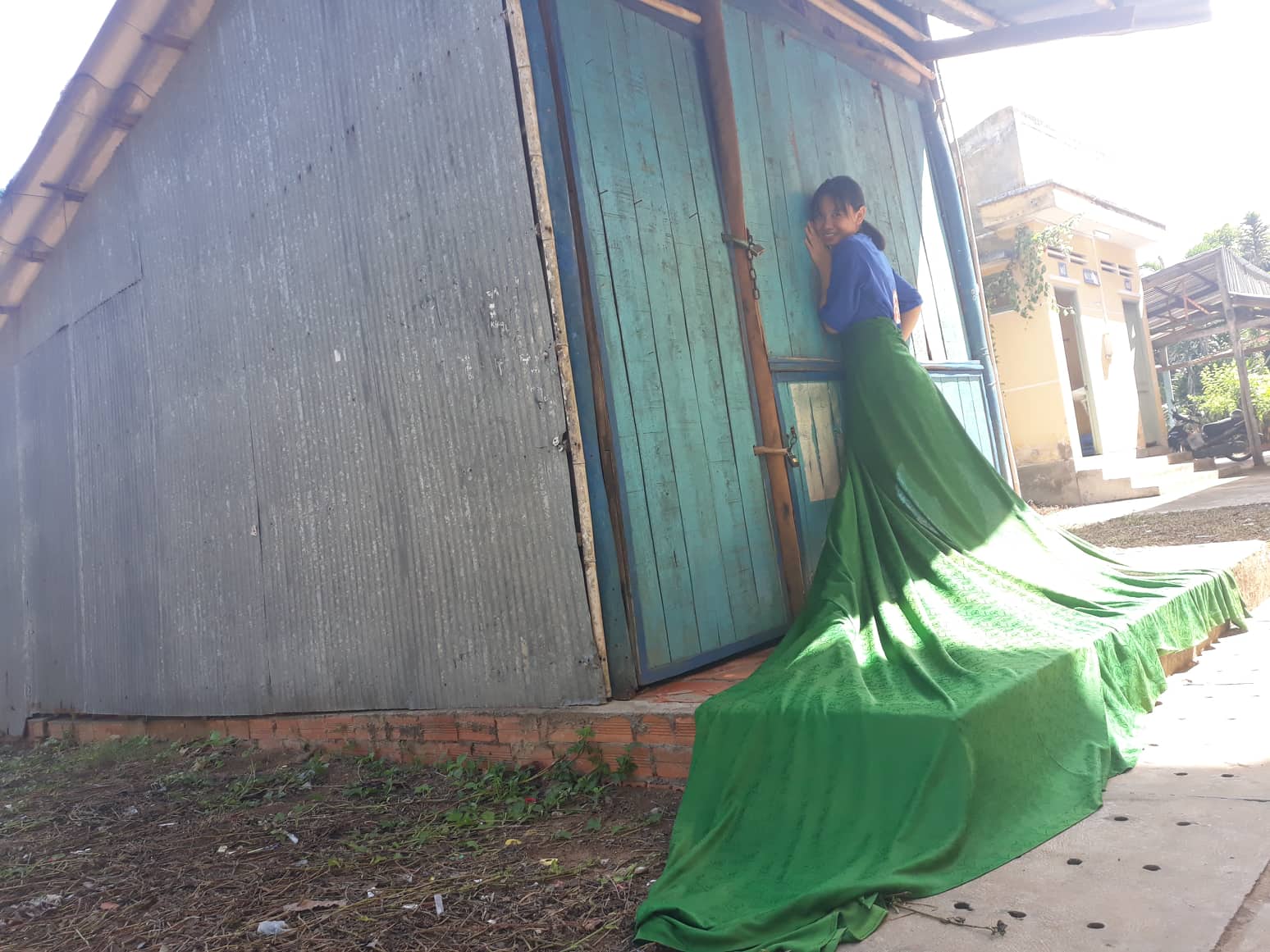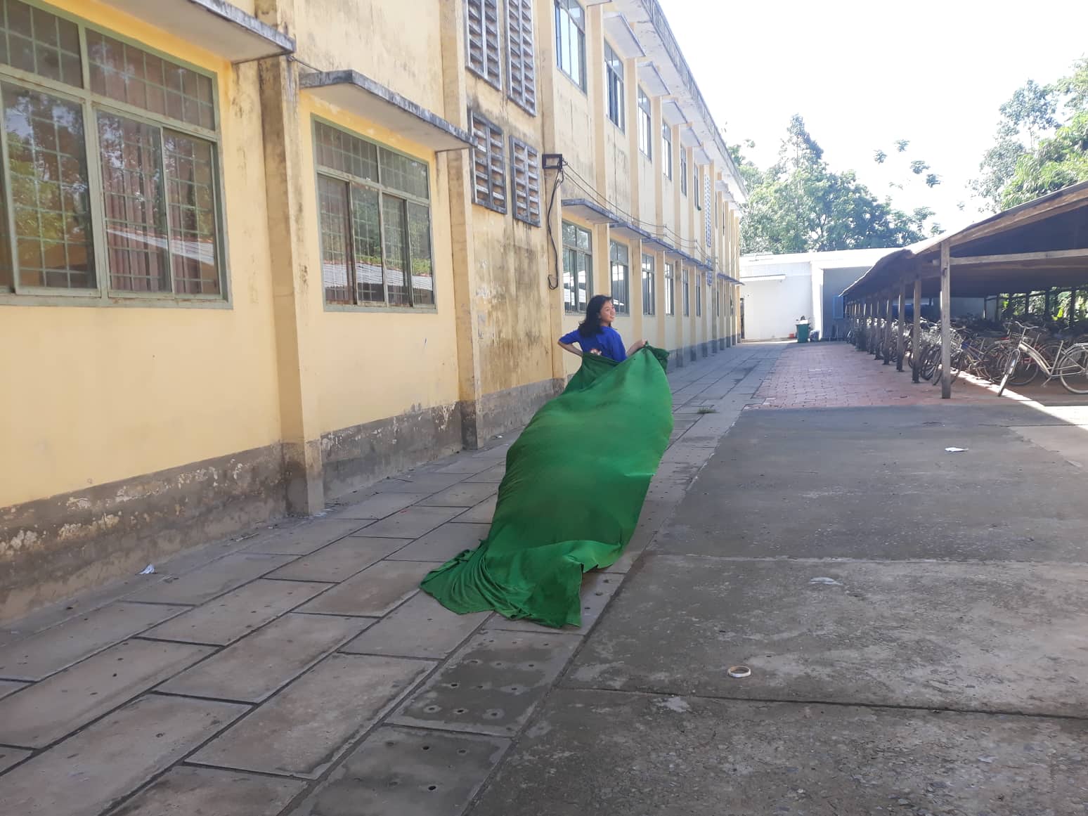 Tấm phông màn màu xanh được cô bạn sử dụng làm phụ kiện chính yếu.