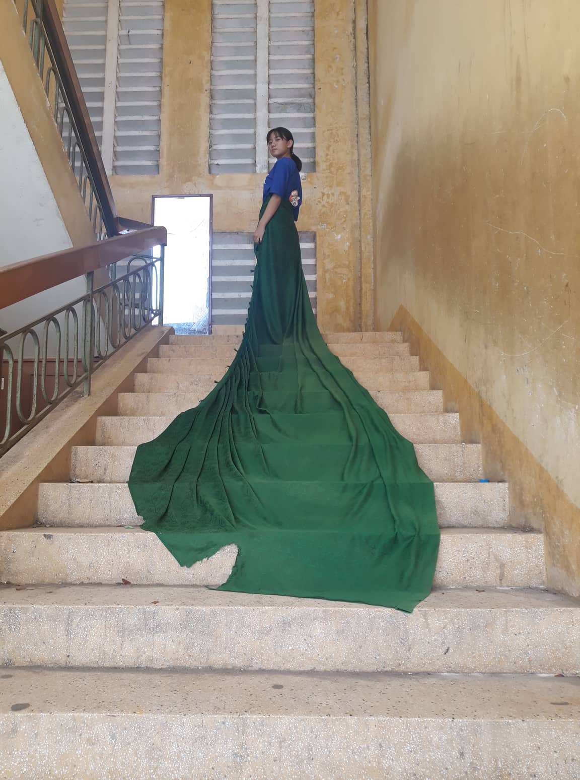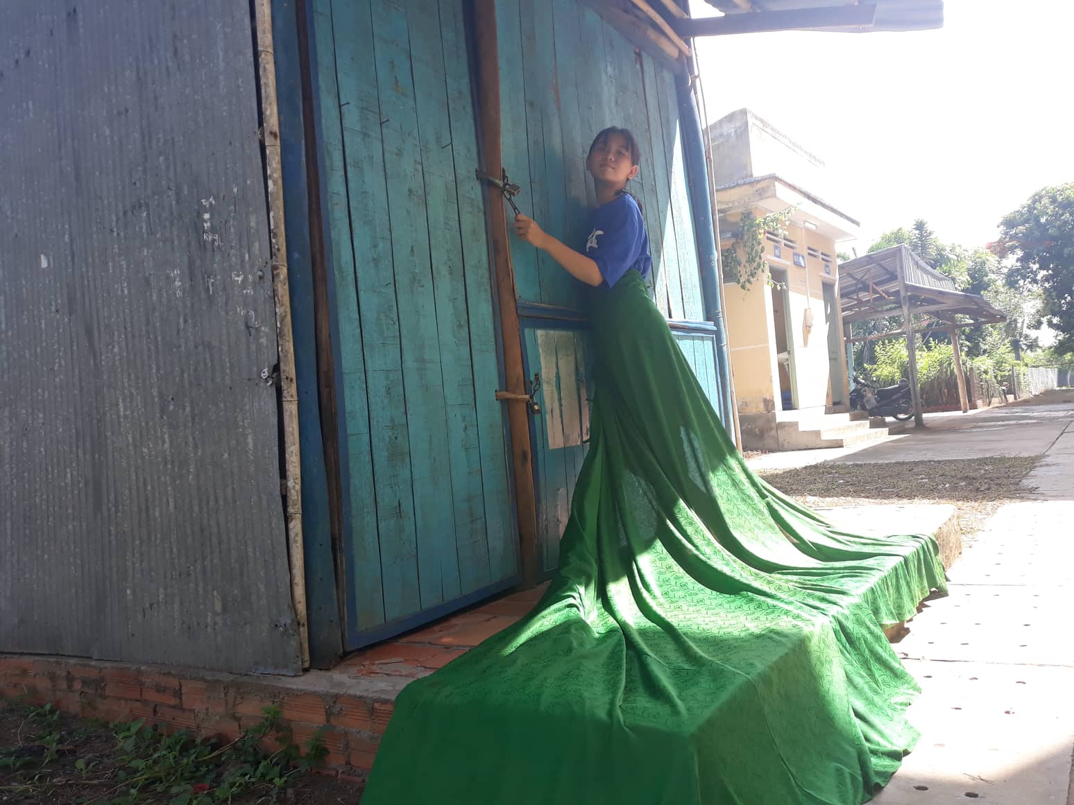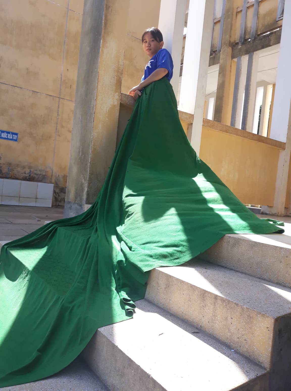 Bên cạnh đó, Nhi Ngọc sử dụng phụ kiện là tấm phông màn xanh với kích thước lớn để tạo thành một chiếc váy dài, kết hợp những động tác: tung váy, xòe váy… cực nhuần nhuyễn đã giúp “nhiếp ảnh” bắt được những khoảnh khắc cực ấn tượng thế này đây: