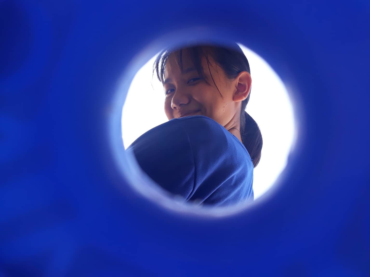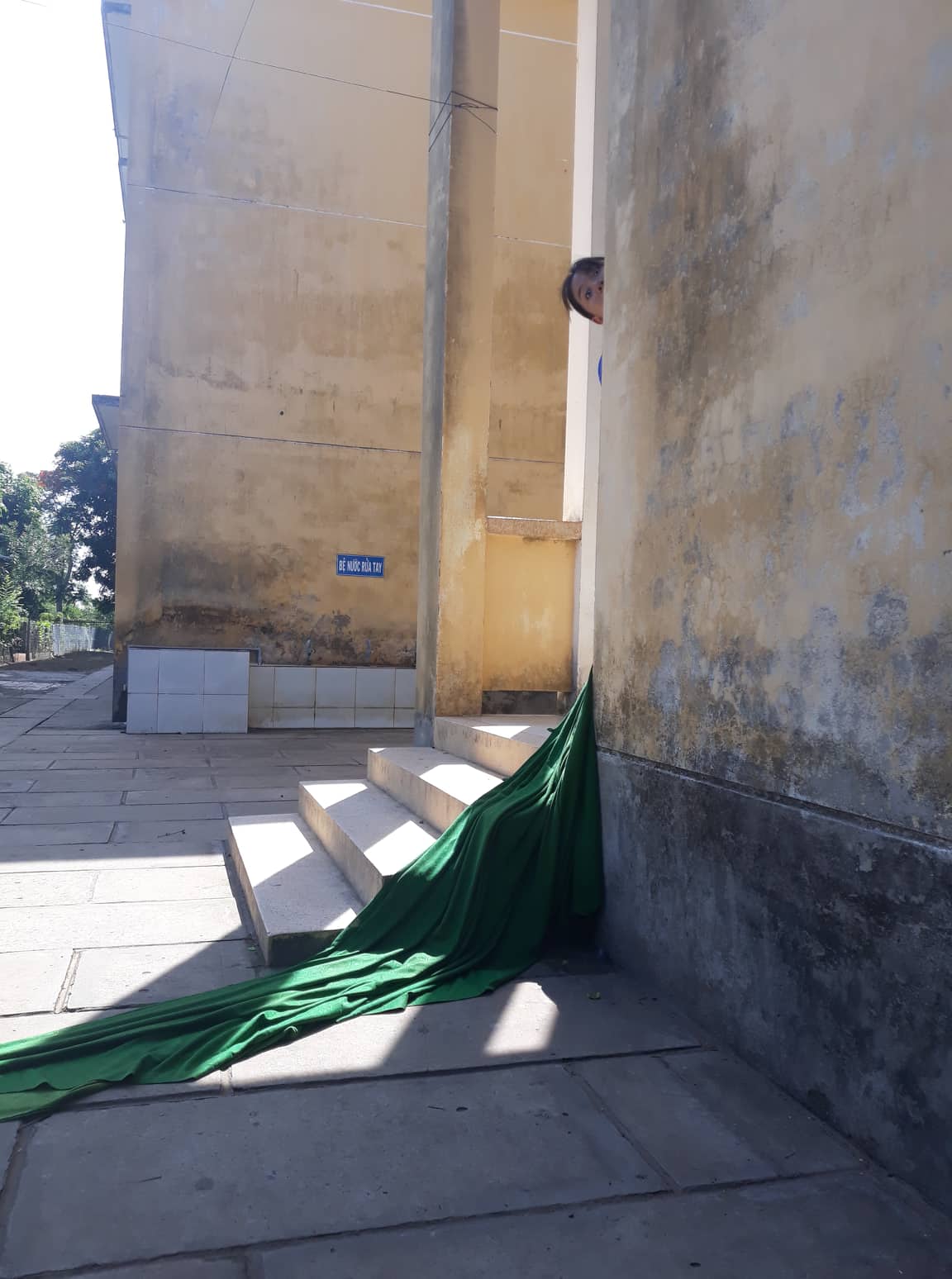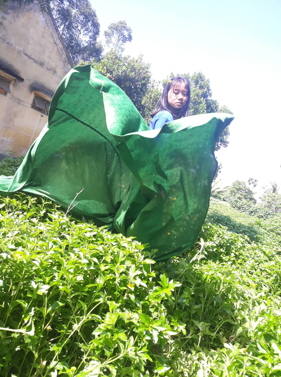 Bên cạnh đó, Nhi Ngọc sử dụng phụ kiện là tấm phông màn xanh với kích thước lớn để tạo thành một chiếc váy dài, kết hợp những động tác: tung váy, xòe váy… cực nhuần nhuyễn đã giúp “nhiếp ảnh” bắt được những khoảnh khắc cực ấn tượng thế này đây: