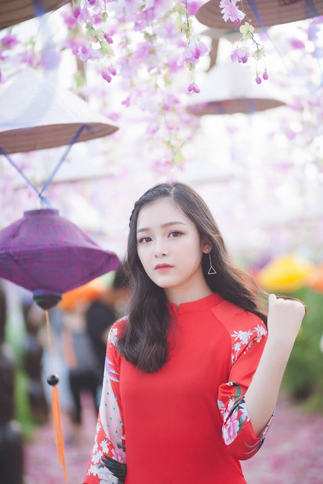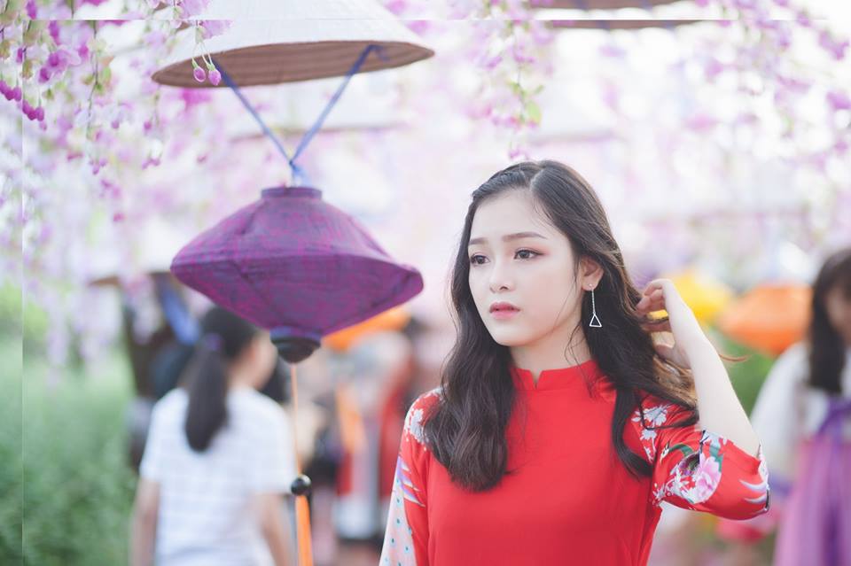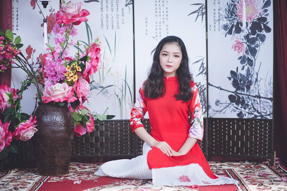 Đến từ đất mỏ Quảng Ninh, Nguyễn Thu Hiền (sinh năm 1999, hiện đang là sinh viên khoa Du lịch, ĐH Mở Hà Nội) rất thích thú khi được ghé thăm, chụp ảnh với background Trung thu. Cô bạn diện áo dài đỏ rực rỡ, tóc xõa buông nhẹ tôn lên làn da trắng hồng để thực hiện một bộ ảnh đáng nhớ.
