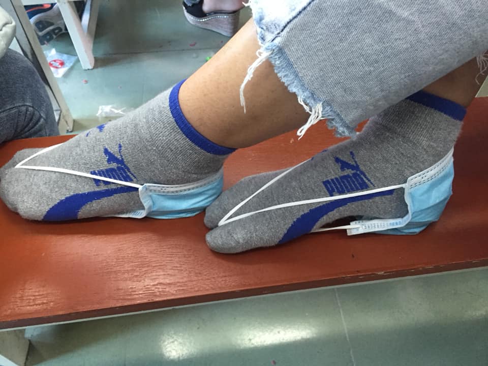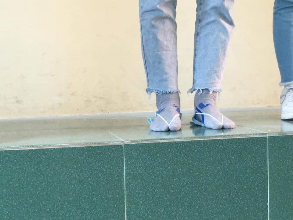 Mới đây, trên group Trường Người Ta vừa xuất hiện một câu chuyện tương tự, theo đó, nhà trường quy định học sinh khi đến lớp phải dép có quai hậu, tuy nhiên, cô bạn này lại “lỡ” mang dép đến lớp. Bị kiểm tra đột xuất, cô bạn này đã nghĩ ra sáng kiến… dùng khẩu trang làm giày quai hậu cực sáng tạo và không kém phần nghịch ngợm.