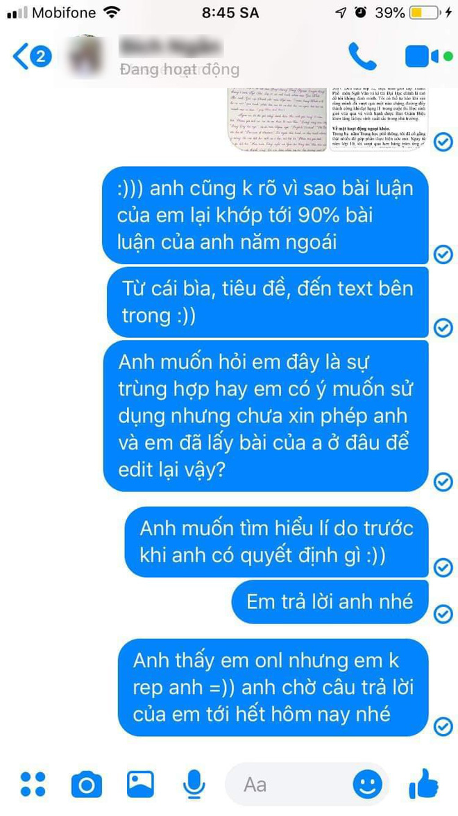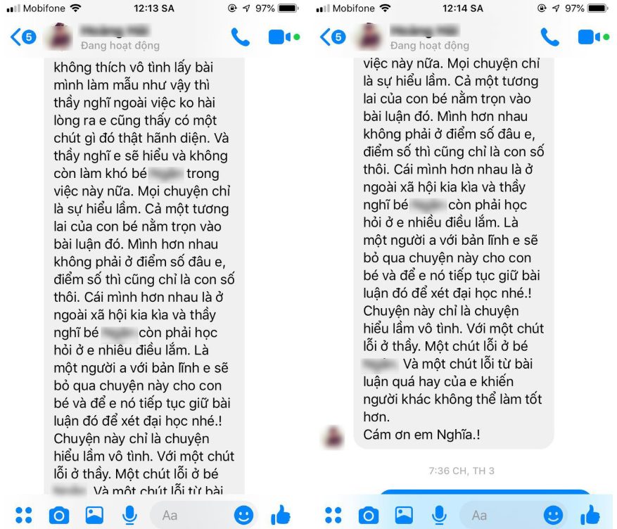Sự việc chưa dừng lại ở đó khi Trọng Nghĩa tiếp tục nhận được những dòng tin nhắn dài ngoằng của 1 người đàn ông tự xưng là thầy giáo chủ nhiệm của em B.B.N, là người cung cấp bài luận của Nghĩa để em ấy tham khảo.