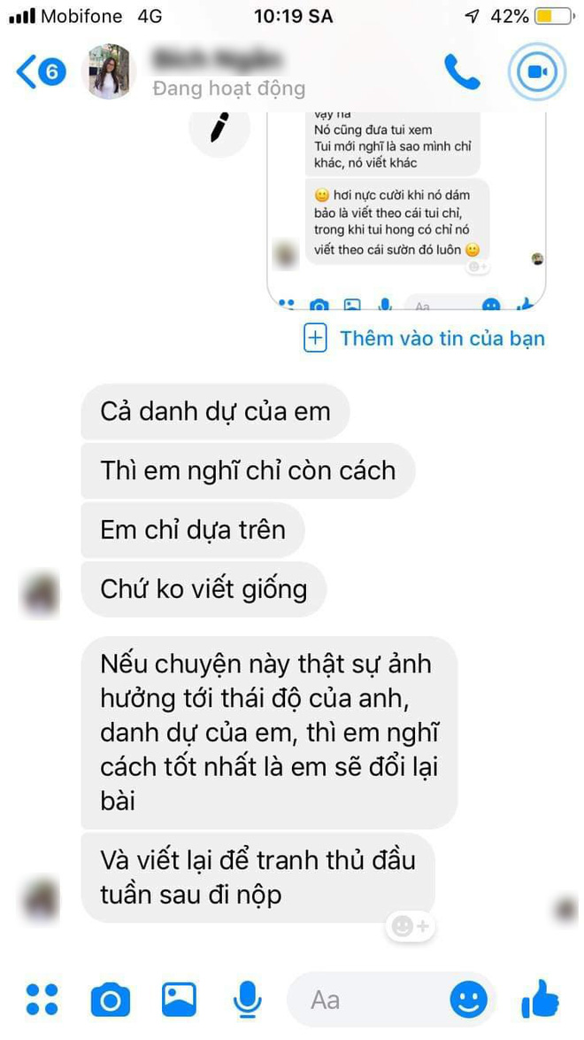 “Chừng 7h tối khi mình họp xong, thì có một giáo viên nhận là thực tập sinh từng dạy N nhắn tin cho mình với cốt ý là thầy là người đã nhờ bạn trong khoa văn lấy bài của em gửi N chỉ vì muốn N có tư liệu tham khảo. Ơ vô lý, em nộp cho trường em là bản viết tay thì làm sao thầy có file word, và thầy mong muốn rất hài hước luôn là mong mình Là Một Người Học Văn Nên Sẽ Bao Dung, Rộng Lượng Bỏ Qua Cho N Lần Này Để N Vào Đại Học, Vì Em Còn Cả Tương Lai Phía Trước, Mình Không Nên Đôi Co Chuyện Điểm Số Như Thế Này.