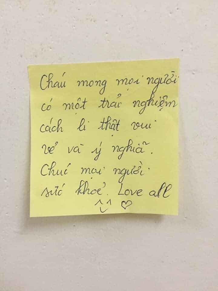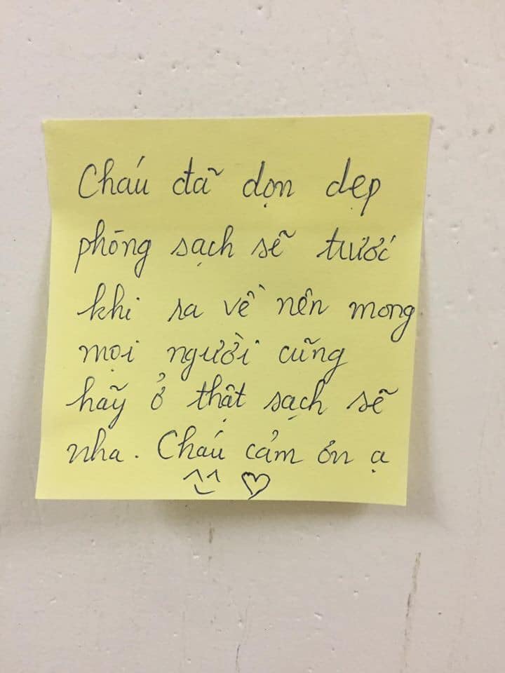 Cô bạn Hà Trang cho hay, ngày 27/3, Trang và các bạn nhận được thông báo của Ban quản lý Ký túc xá yêu cầu sinh viên dọn dẹp phòng ở để sẵn sàng chuẩn bị các phương án nếu UBND tỉnh trưng dụng làm các khu cách ly tập trung phòng chống dịch COVID -19. Ngay tối 27/3, Hà Trang đã thức đến 2 giờ sáng dọn dẹp phòng ốc sạch sẽ và cẩn thận ghi lại những note nhắn nhủ, dặn dò rất ấm áp với người cách ly.