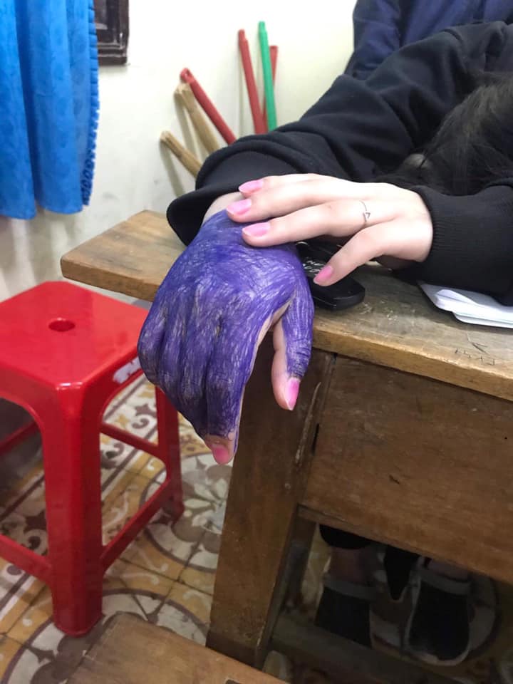 Bạn bè xung quanh cô bạn này có lẽ đã lên kế hoạch từ trước để “tô màu” đôi bàn tay của nữ sinh này