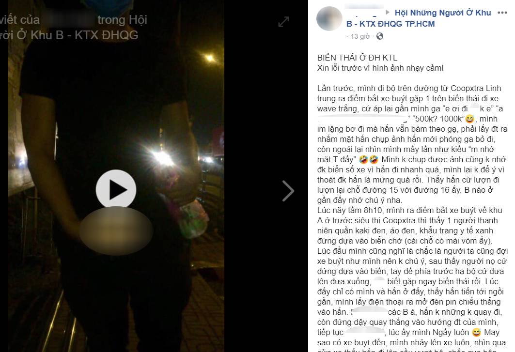 C.K.N.L, hiện đang sinh sống tại KTX Đại học Quốc gia TPHCM kể lại, khi tới thư viện Trung tâm (thuộc làng ĐH Thủ Đức) để rút tiền, cô cũng bắt gặp biến thái khoe của quý.