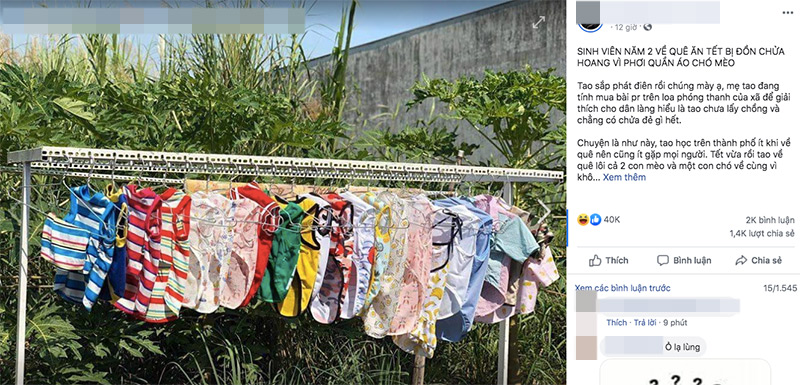 Mới đây, một nữ sinh vừa chia sẻ câu chuyện “dở khóc dở cười” về những tin đồn thất thiệt khi về quê khiến cư dân mạng vô cùng đồng cảm. Theo đó, trong dịp nghỉ Tết, cô bạn đi học ở thành phố về nhà ăn Tết và có mang theo rất nhiều quần áo của chó mèo để giặt phơi.