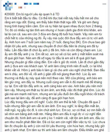 Lúc chưa làm được chuyện đó, anh ý còn nói lời yêu thương, còn hứa hẹn, nhưng bây giờ anh ý lạnh nhạt. Em tâm sự thì anh bảo em lắm chuyện. Điều khiến em ghê tởm hơn là anh kể về chuyện đó, về cái đó của anh và em một cách rất thản nhiên và với những từ ngữ khiến em ghê tởm, cứ như anh đã làm vậy với ai khác. Bây giờ em phải làm sao đây ạ? Em thật sự không thể nào quên được chuyện đó. Em cũng không tin nổi những gì đang xảy ra với em. Hai tuần liền em mất ăn mất ngủ. Rồi cuộc đời em sẽ đi về đâu. Anh thì càng ngày càng lạnh nhạt. Rồi em còn có tư cách mà yêu ai nữa. Em như muốn phát điên lên. Em khóc hằng đêm. Cứ nghĩ đến là em khóc, em khóc đến muốn nổ tung.