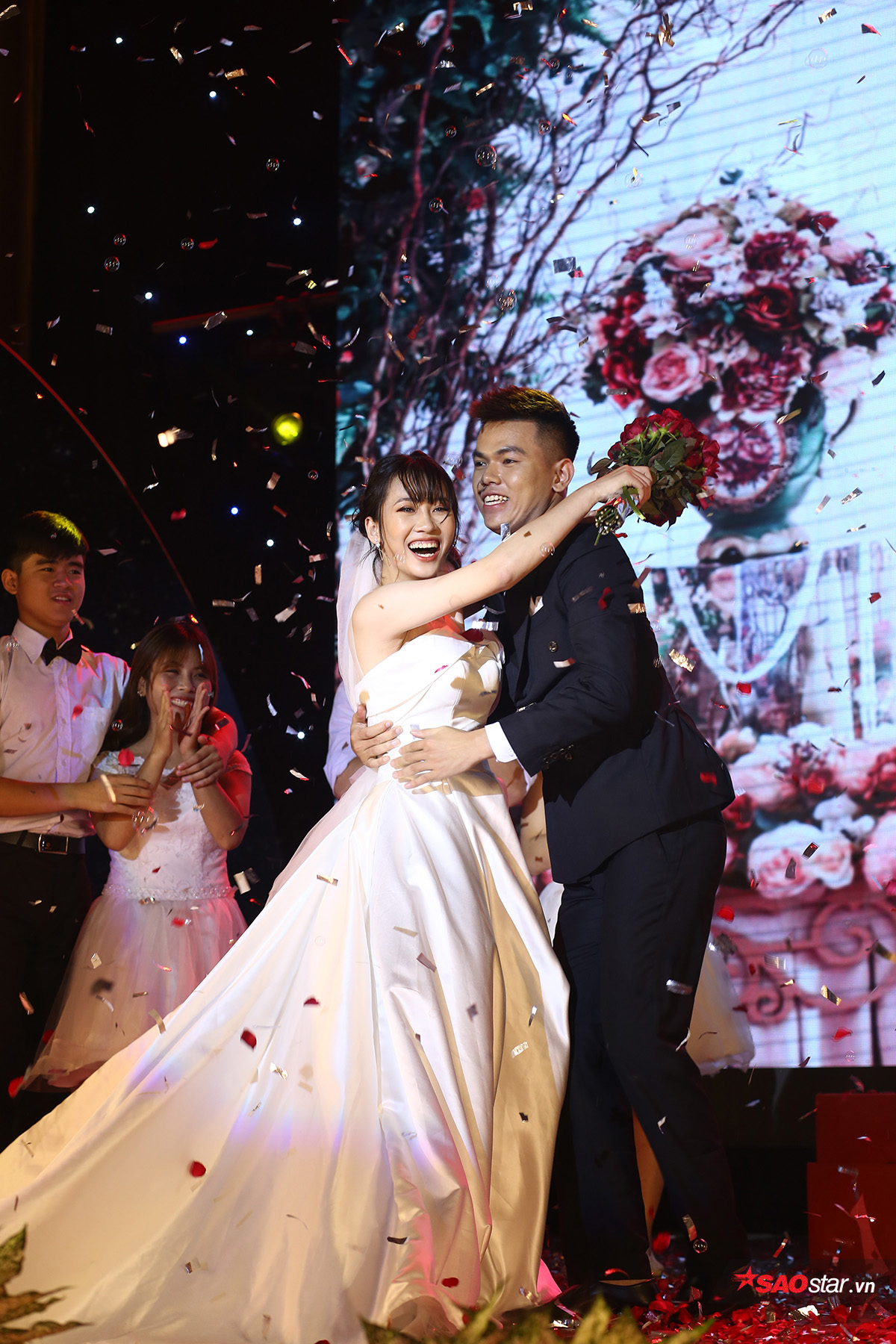Huyền Trang đã dàn dựng sân khấu như một đám cưới thực sự, với pháo giấy, bong bóng lãng mạn và đặc biệt là sự xuất hiện của bạn diễn với màn trao nhẫn đính hôn.