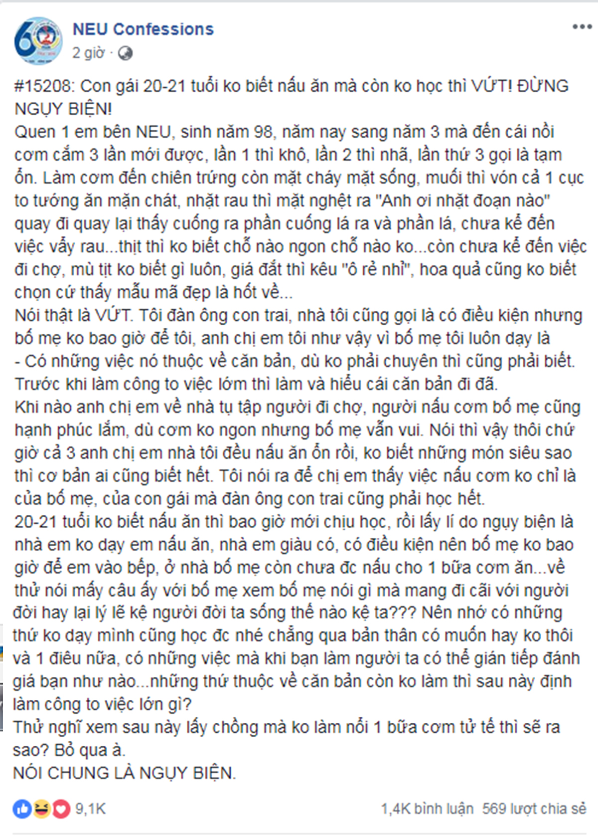 Mở đầu đoạn post, chàng trai kể tội cô gái, cho rằng đây chính là “thánh vụng”. Cụ thể, cậu bạn viết: “Mình quen 1 em bên NEU, sinh năm 1998, năm nay sang năm 3 mà đến cái nồi cơm cắm 3 lần mới được, lần 1 thì khô, lần 2 thì nhão, lần thứ 3 gọi là tạm ổn. Làm cơm đến chiên trứng còn mặt cháy mặt sống, muối thì vón cả 1 cục to tướng ăn mặn chát, nhặt rau thì mặt nghệt ra “Anh ơi nhặt đoạn nào”? Mình quay đi quay lại thấy cuống ra phần cuống, lá ra phần lá, chưa kể đến việc vẩy rau… Thịt thì không biết chỗ nào ngon chỗ nào không, đi chợ thì mù tịt không biết gì luôn, giá đắt thì kêu “ô rẻ nhỉ”, hoa quả cũng không biết chọn cứ thấy mẫu mã đẹp là hốt về..”
