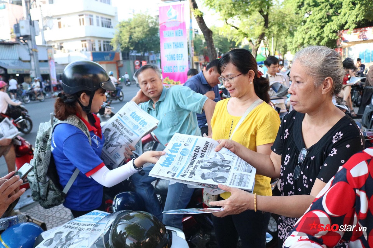 Đội tình nguyện viên phát báo cho phụ huynh đưa con em đến điểm thi.