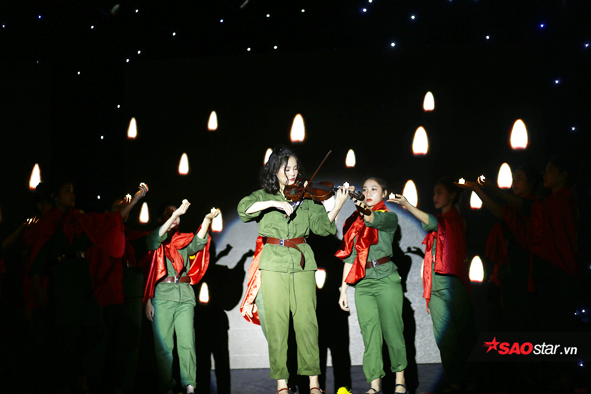 Hoa khôi áo dài Trần Đinh Phương Mai lại khiến toàn bộ khán giả xúc động khi tự mình đệm đàn violin da diết trong vở nhạc kịch về thời kháng chiến