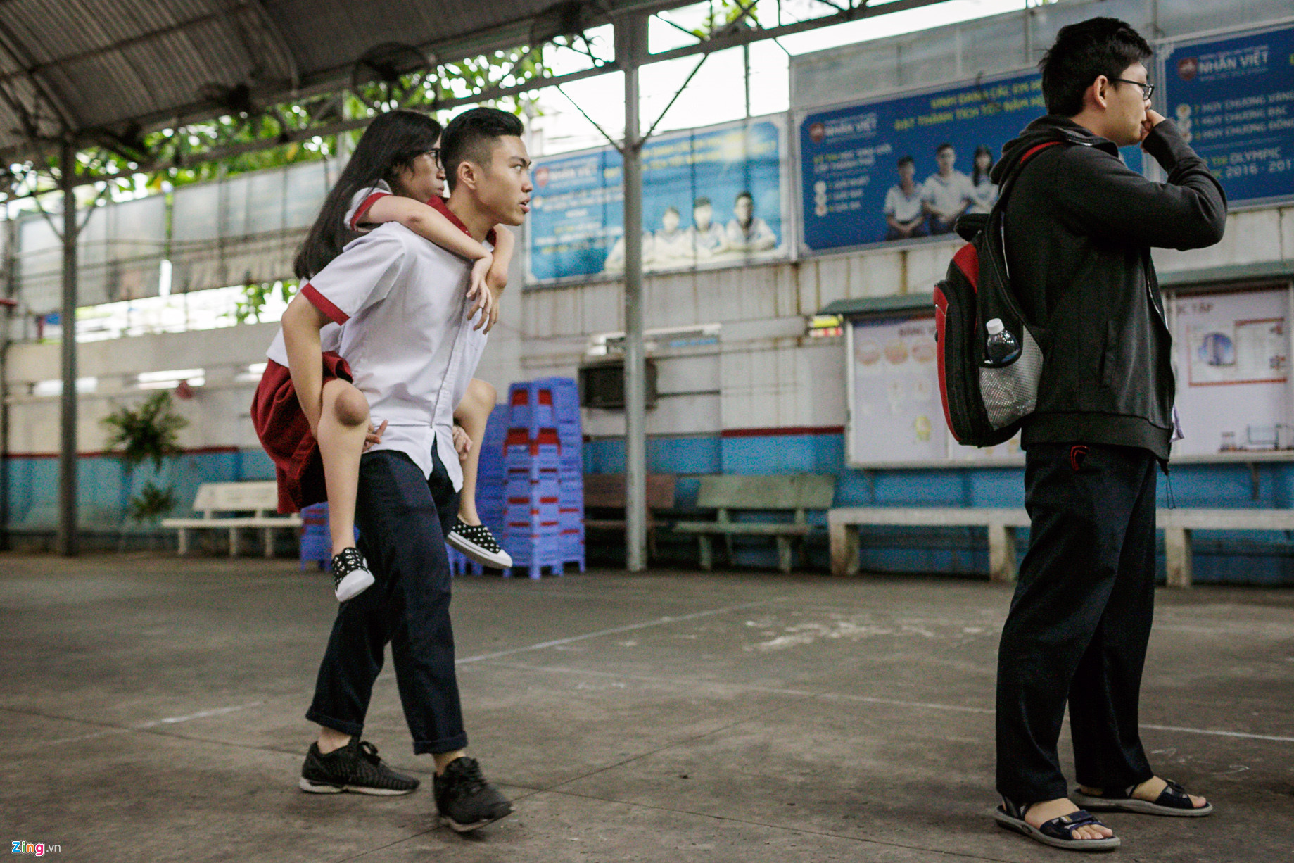 Nguyễn Du Hải Âu, học sinh lớp 12A6, bị đa khớp bẩm sinh, không thể đi lại bình thường được. Mỗi ngày, các bạn cùng lớp phải thay phiên cõng em lên, xuống lớp học để người nhà đưa về.