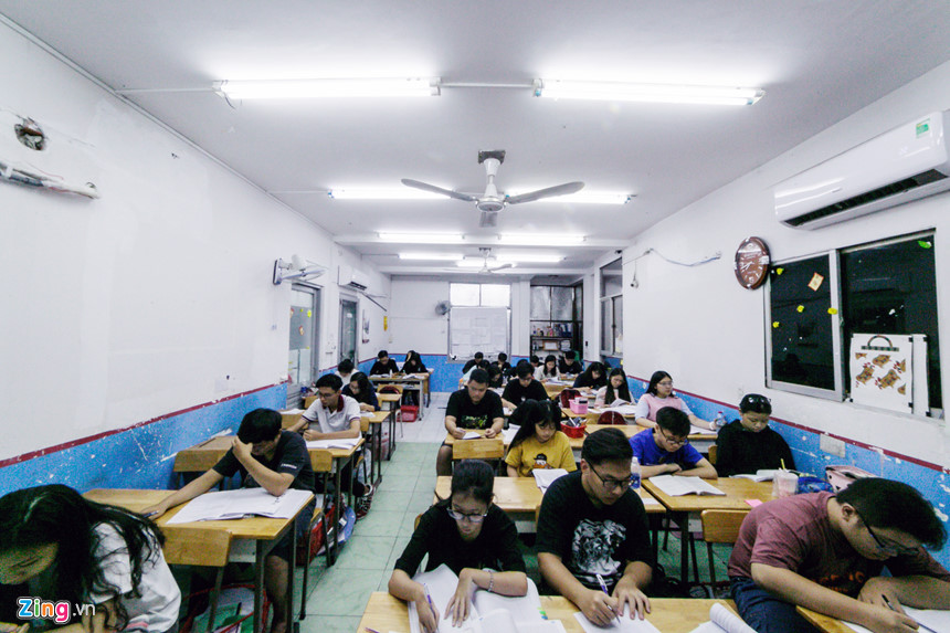 “Buổi sáng và chiều, các em học với giáo viên bộ môn, luyện những dạng đề mới, câu hỏi khó. Buổi tối, chúng tôi chia học sinh thành từng nhóm nhỏ để tự học, khảo bài với nhau”, thầy Nguyễn Lam Quang Thoại, Phó hiệu trưởng nhà trường, nói.