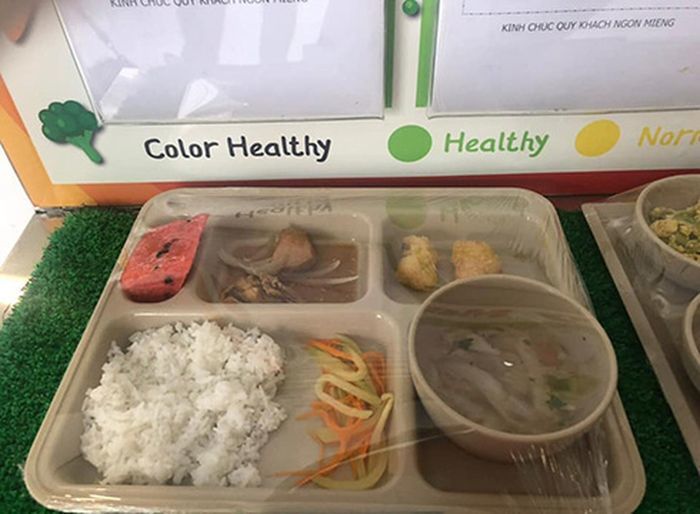 Theo đó, phần cơm của con chị chỉ bao gồm 4 món: 2 miếng gà kho, 2 miếng cá tẩm bột chiên, ít su su xào, canh bắp cải và miếng dưa hấu.